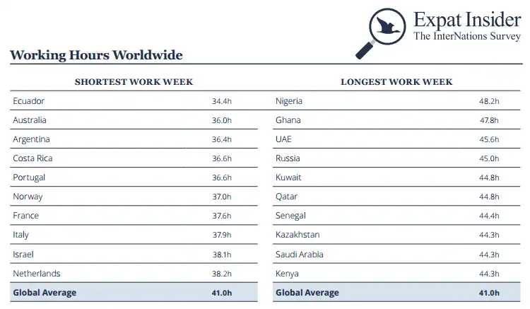 The country on the opposite end of the scale is Nigeria, where expats spend approximately 48 hours per week at work. In Ghana it’s 47.8 hours and in the UAE, our survey participants have to dedicate almost 46 hours of their time to the job.