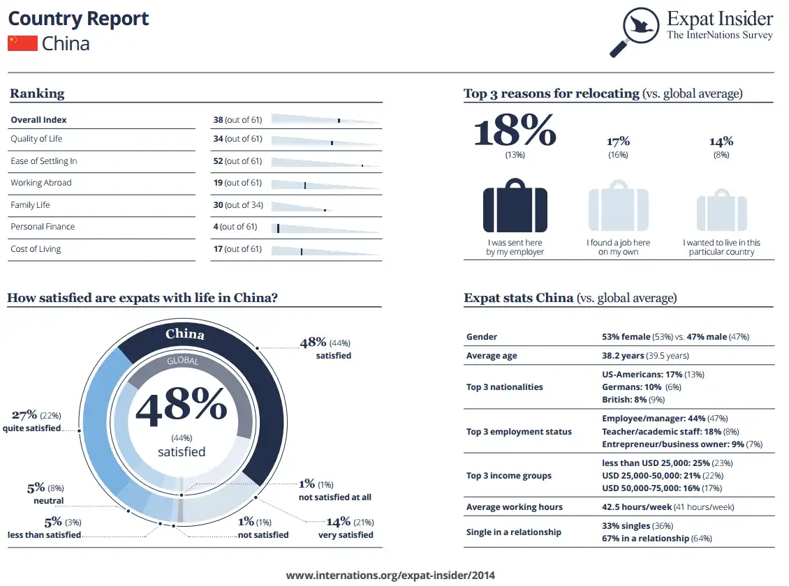 Only 14% of expats in China are completely satisfied with their life abroad, which lags behind the global average of 21%. Moreover, survey participants also indicate a marked dissatisfaction with the country’s medical facilities; only 32% agree the system is good compared to the global average of 53%.