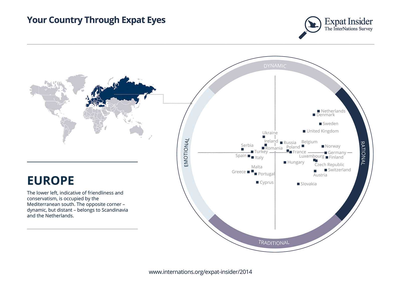 For this series of charts, we asked expats a number of questions about how they’d describe their current country of residence and especially the people. Questions included, for example, “would you say they are rather innovative or traditional? More reserved or more outgoing?” Responses were collected on a rating scale of one to seven.