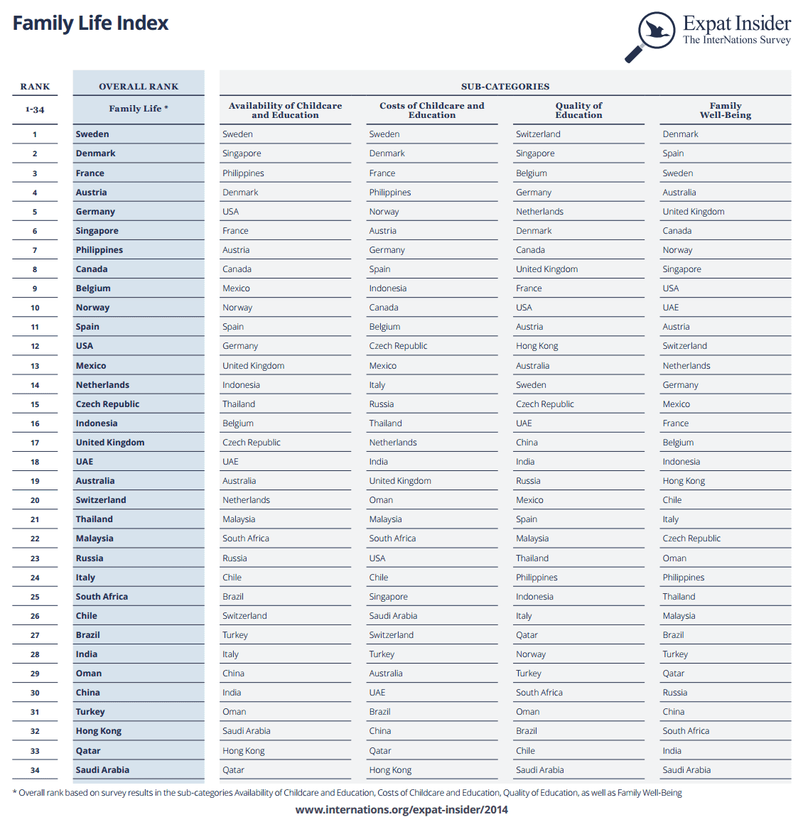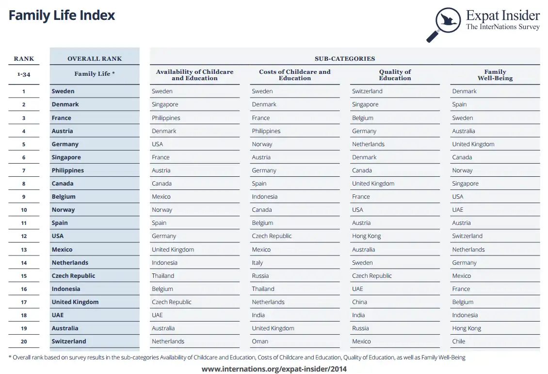 Our Family Life Index takes a closer look at education and childcare, as well as expat family life in general. It rates more than 30 countries, according to different factors such as availability, quality, and cost of childcare and education, and the quality of family life in a broader sense.