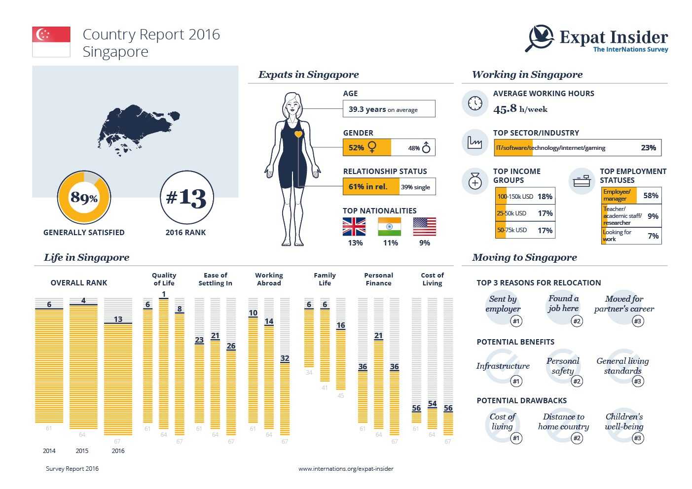 Working in Singapore is good for your career prospects, according to 61% of expats. Moreover, the state of the country’s economy receives an impressive 86% of positive opinions from expats, compared to 56% globally. Also, 14% of the survey respondents who decided to share income-related information have a household income of more than 250,000 USD, which is a significant difference to just 3% worldwide.