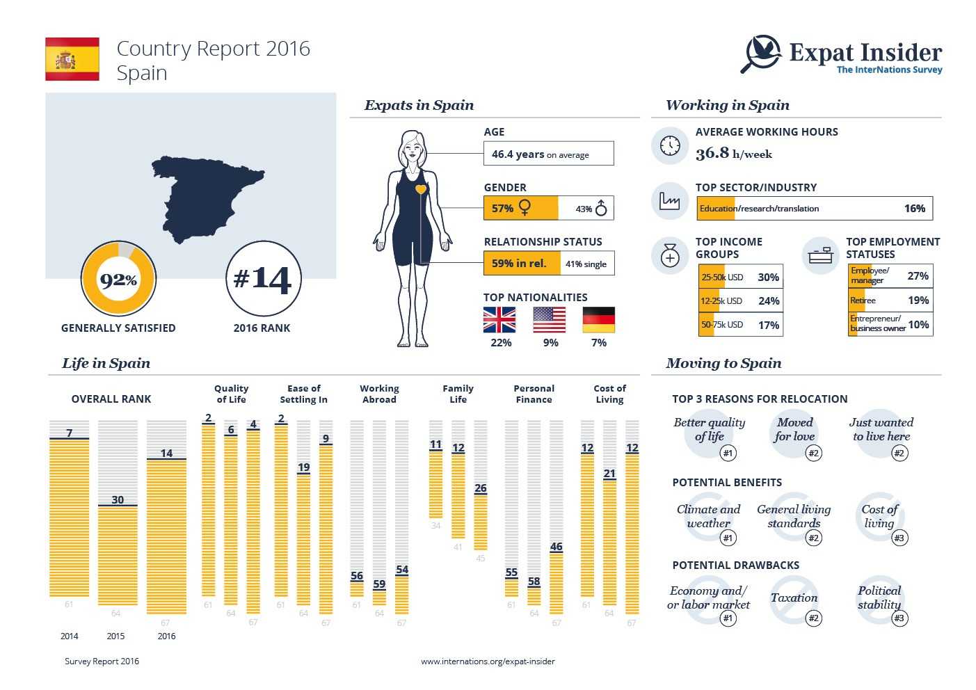 Expat life in Spain might have its shortcomings, but a broad majority of expats (92%) claim to be overall satisfied with their life there. One-quarter of the respondents even say they are very satisfied as opposed to the global average of 15%. Indeed, Spain proudly ranks 10th out of 67 in the Personal Happiness subcategory and 14th in the overall country ranking.