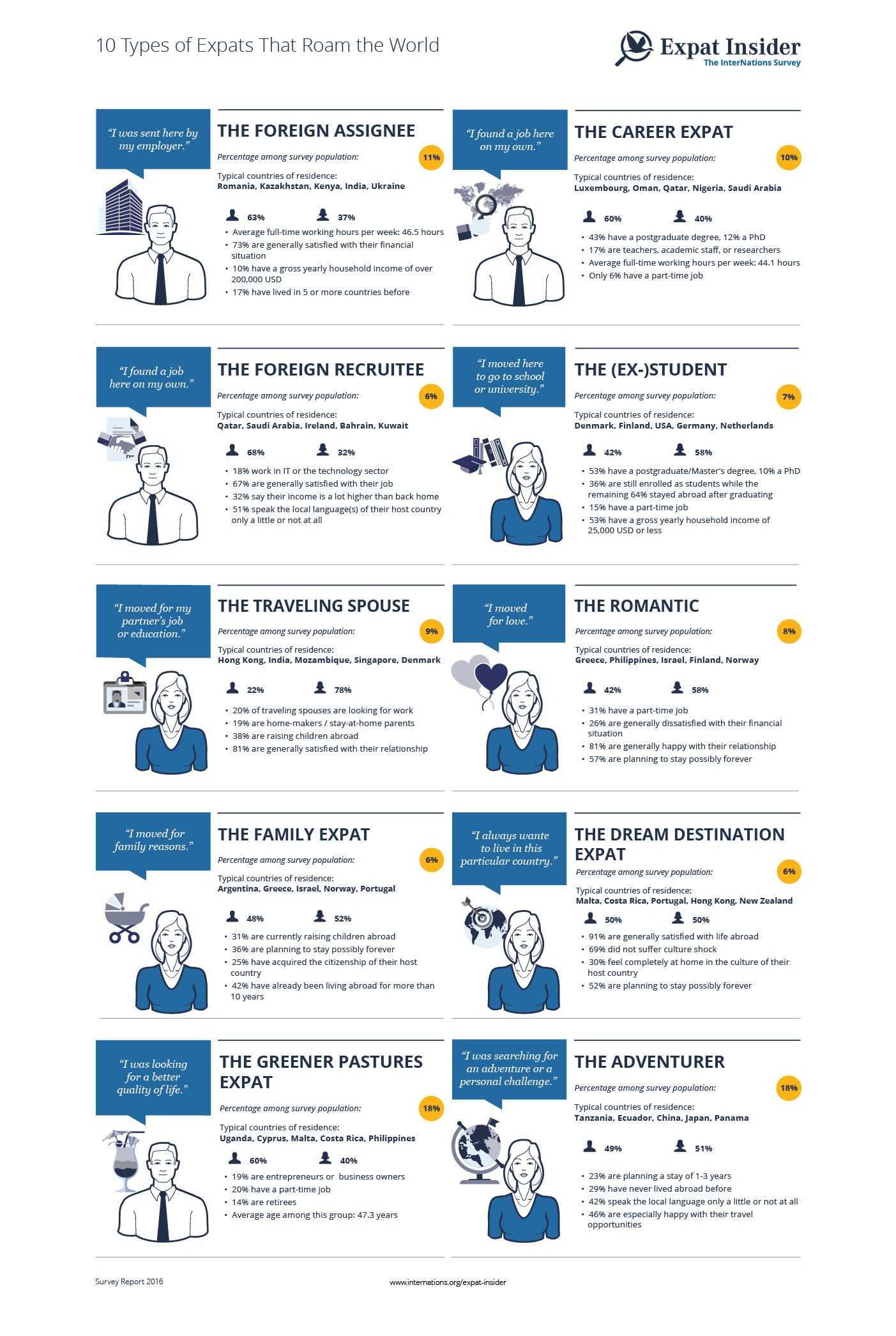The graphic below provides a handy overview of the characteristic features of these ten expat types, such as the predominant gender, their typical countries of residence, their working life, and their motivation for moving abroad.