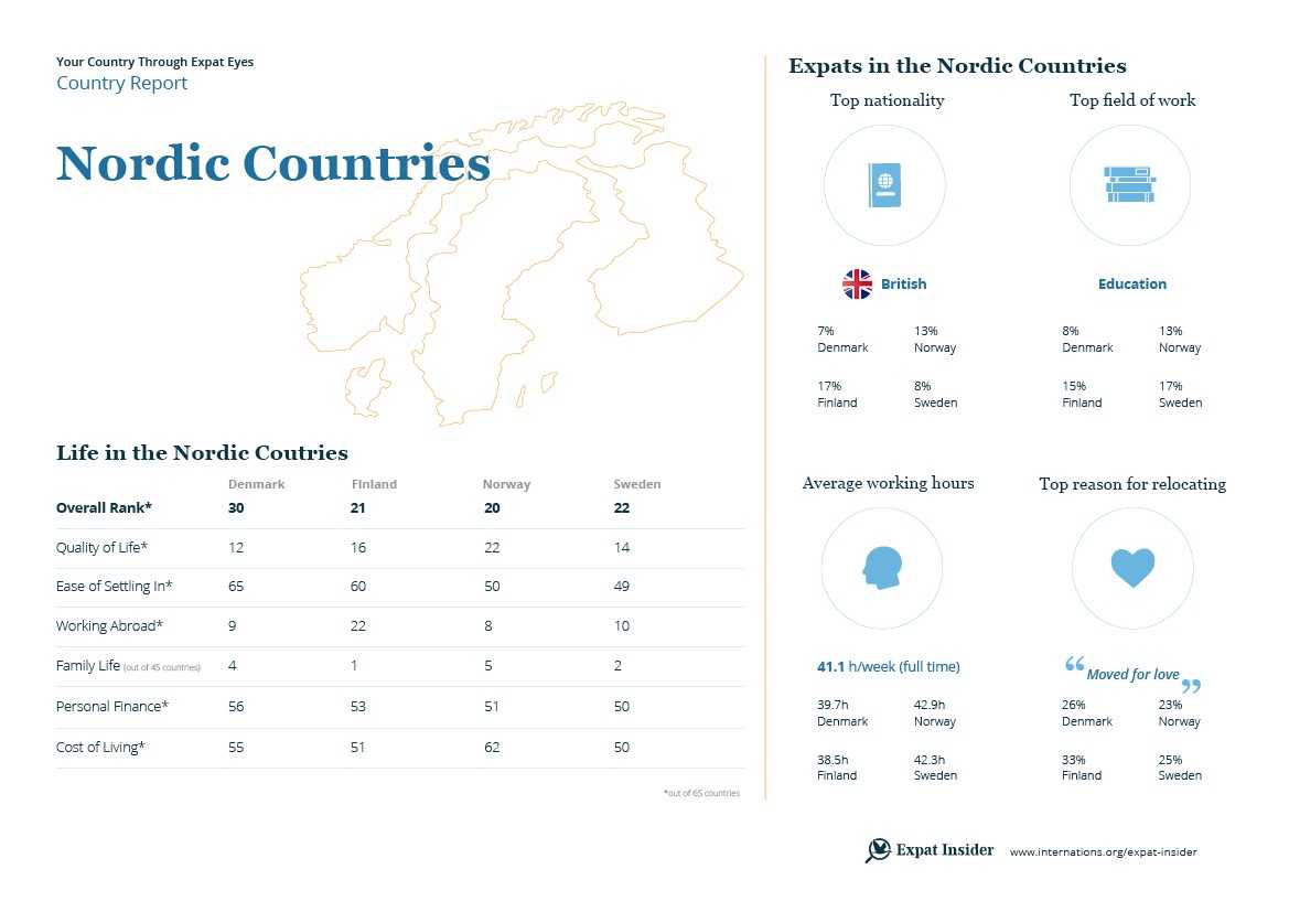 Language barriers are not completely prohibitive for expats, however, as all four countries fall into the top 5 of the World Economic Forum’s English Proficiency Index. This means that over 45% of respondents in the Nordic countries find it easy to get by without speaking the local language. One Spanish expat in Sweden, for example, describes the country as one “where you can live for years without uttering a word of Swedish”.