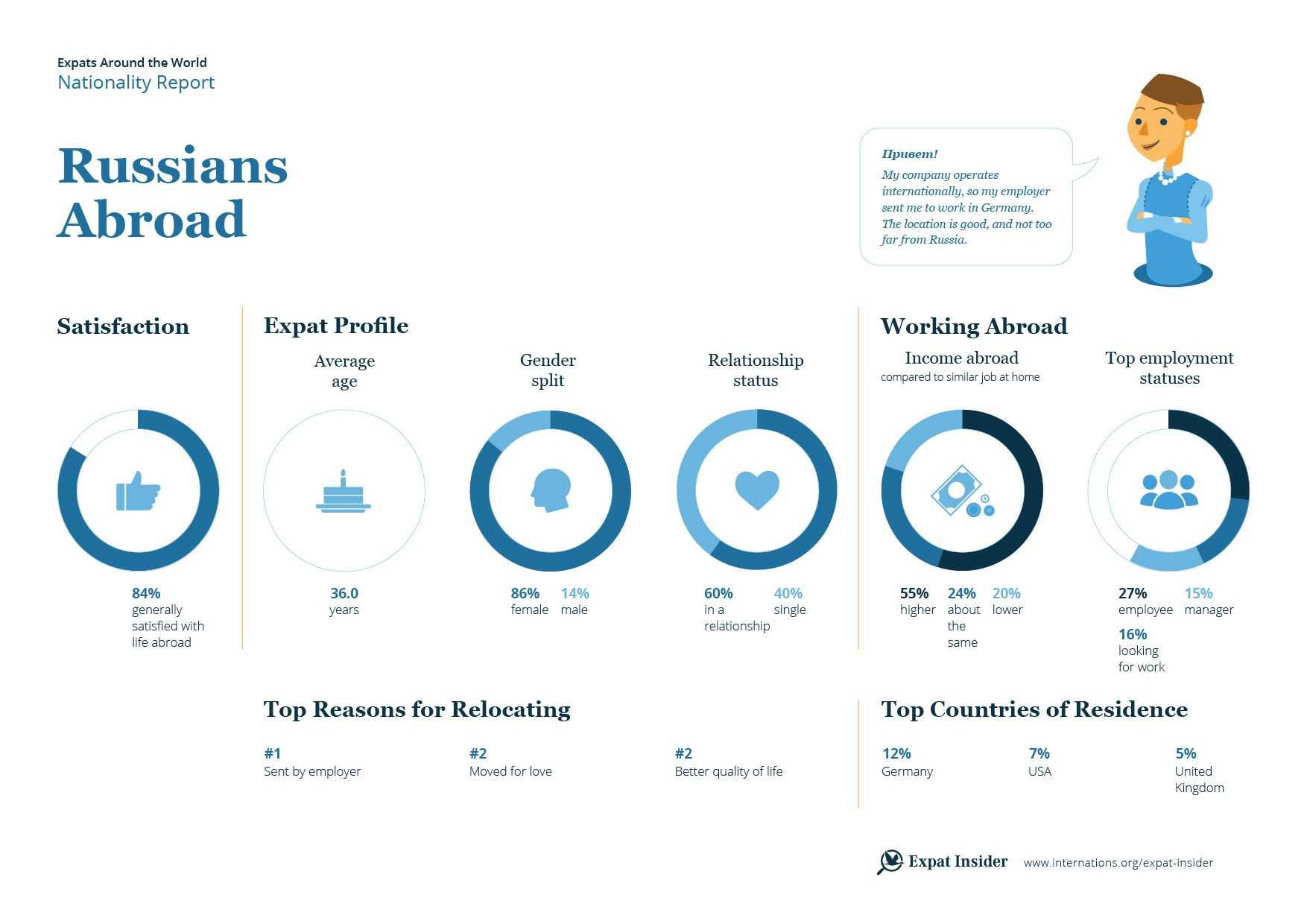 More than a tenth of Russians (11%) moved overseas for love; however, this figure is slightly higher among female respondents (13%), making this the most popular reason for moving abroad among Russian women. Generally, Russian expats are much more likely to be female (86%), and these women tend to be in very international relationships: only around a fifth of Russian women in a relationship (21%) have a Russian partner, compared to 43% of expat women globally who are in a relationship with someone with the same nationality.