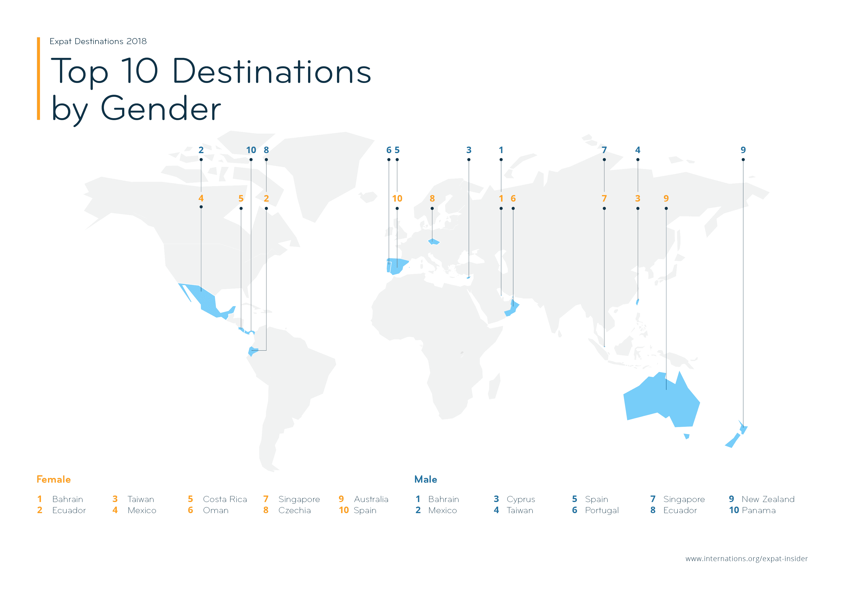 While men and women might not always agree, expats of either gender are enamored with Bahrain: the Gulf State does not only rank first in the entire survey, but also in both gender-specific rankings. Among male respondents, Mexico makes it to second place, while it narrowly misses the top 3 in the overall and the women’s ranking, placing fourth in both. Similarly, Taiwan — in second place overall — is regarded favorably by both genders: it ranks third among female respondents and fourth among men. For more details on the best and worst countries for expats in general, please refer to the respective article.