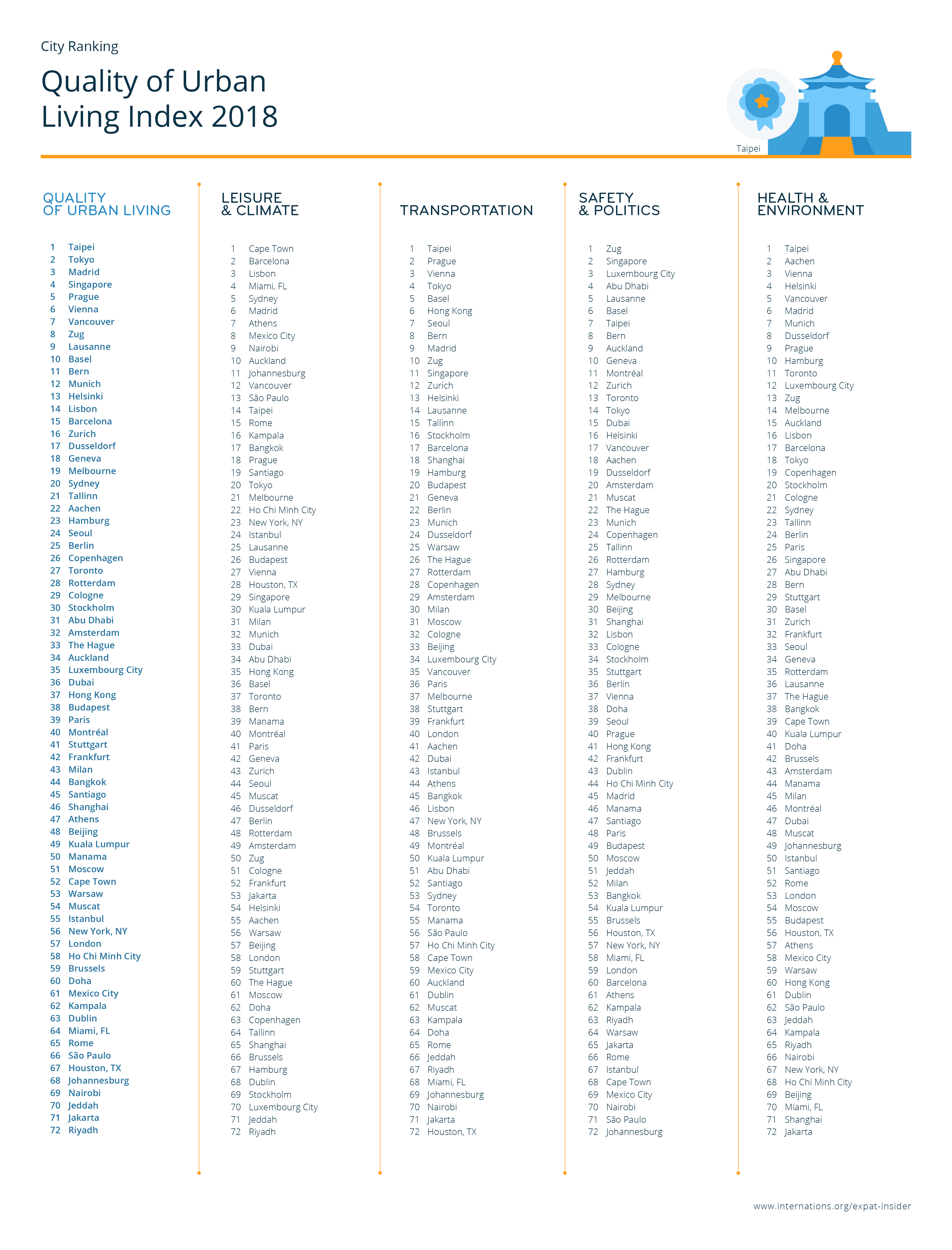 For the Quality of Urban Living Index, survey respondents evaluated the leisure options and climate, local transportation, safety and politics, as well as health and environment in their city. A city needed to have at least 45 respondents in order to rank in this index, which was the case for 72 cities in 2018.