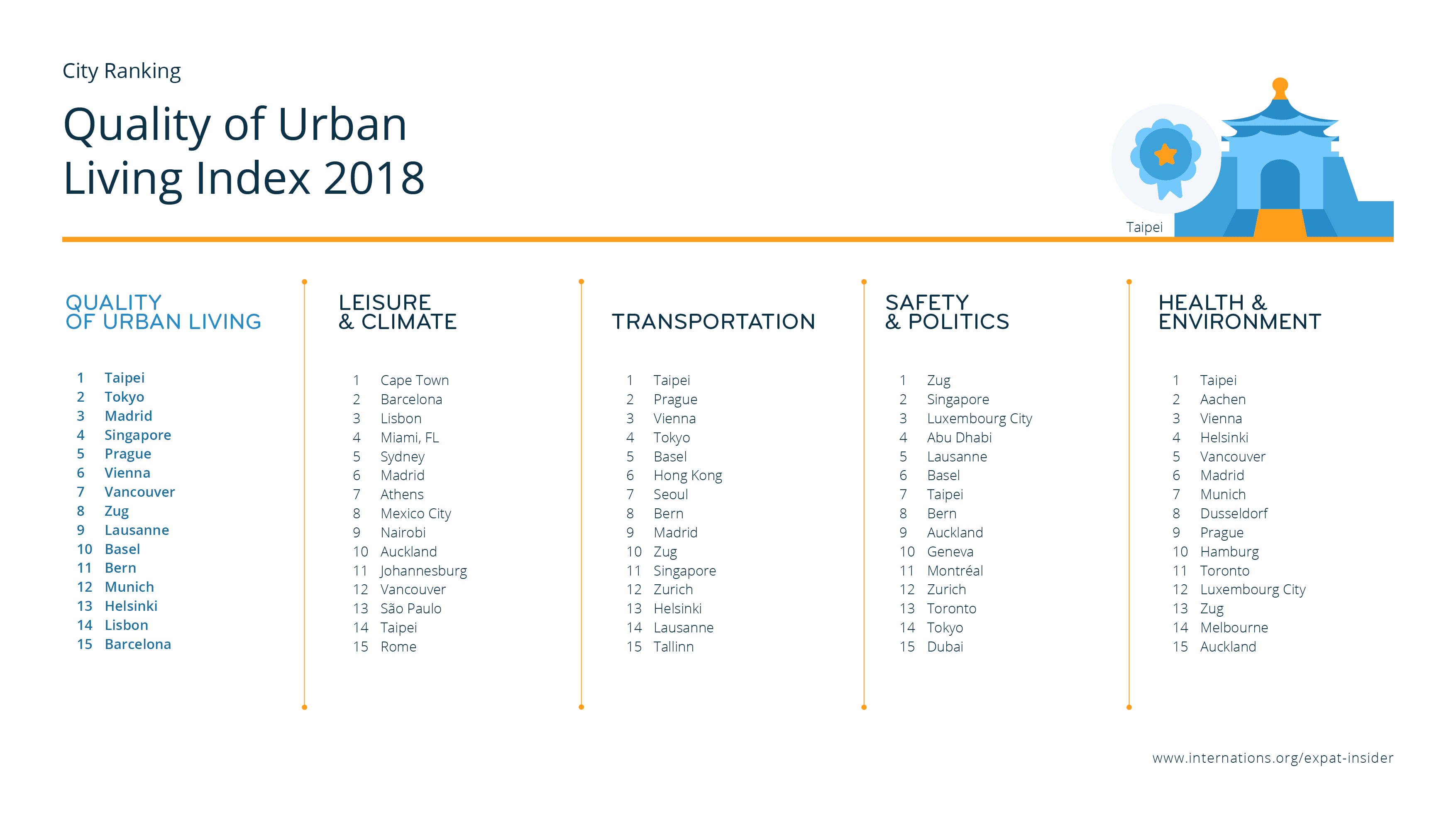 In first place is Taipei, taking the gold medal for both the city’s healthcare and transportation systems. Expats are very pleased with the latter, with every respondent residing there rating the transportation system positively. In fact, 83% of expats in Taipei find the local transportation to be very good. An Indonesian expat compared the traffic to their home city Jakarta, which comes second to last in this subcategory: “There aren’t any traffic jams here like in Jakarta, Indonesia.”