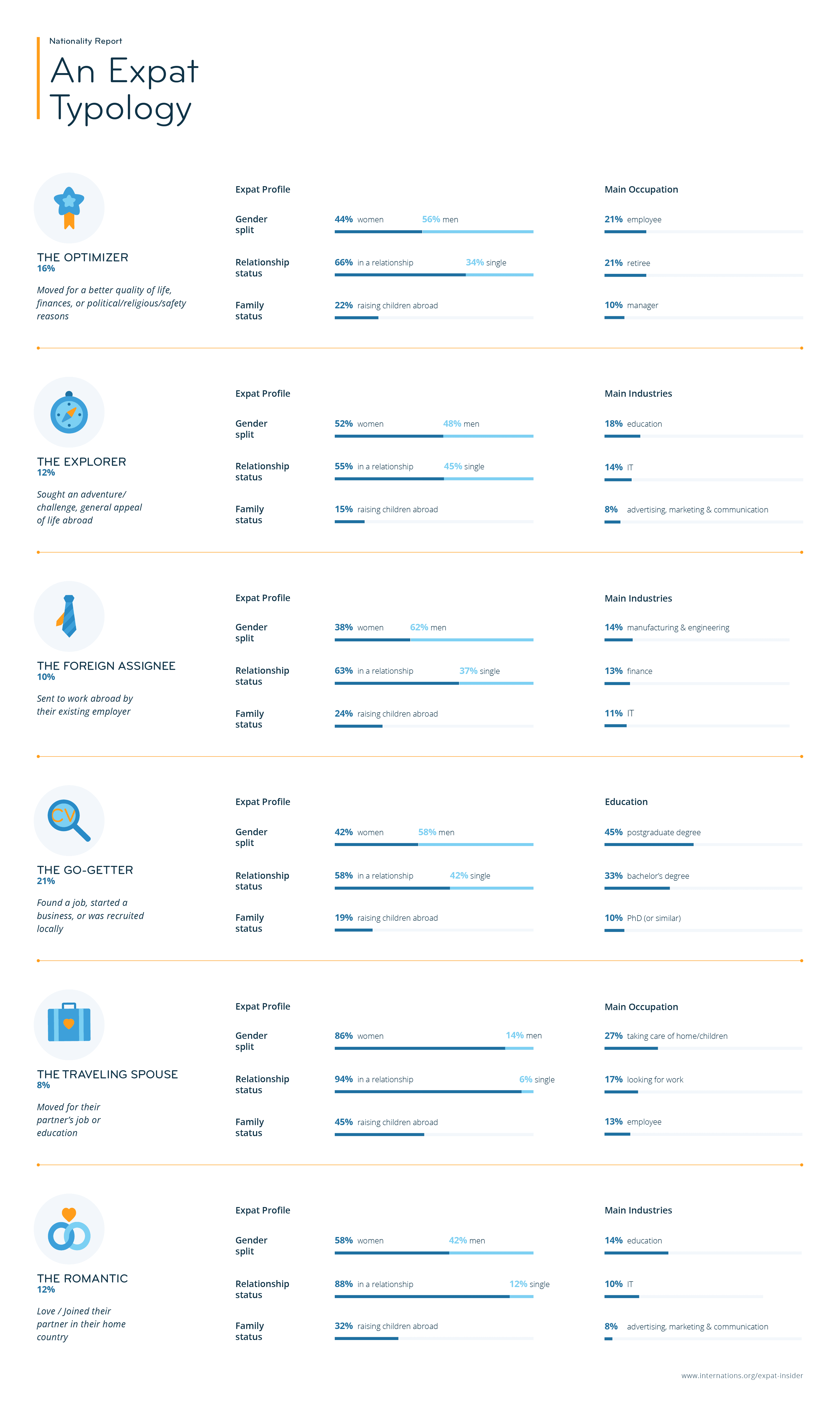 The remaining survey participants gave other reasons for relocating that didn’t fit any of these types (e.g. extended travels or moving abroad for missionary or volunteer work). They are therefore not featured in the statistics for any expat type.