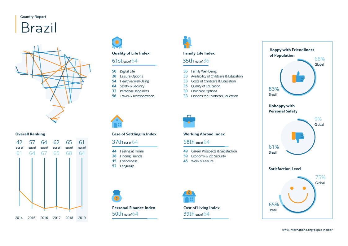 Expats seem to be even less happy with the state of the economy: just 16% are satisfied, which is a huge contrast to the global average of 63%. Since the recession in 2015, Brazil’s economy has been recovering at a very slow pace of roughly 1.1% a year, and economists don’t see it improving any time soon. The unemployment rate in Brazil has nearly doubled since 2012, while the official unemployment survey shows that 28.3 million people are being underutilized — either not working or working less than they could be.