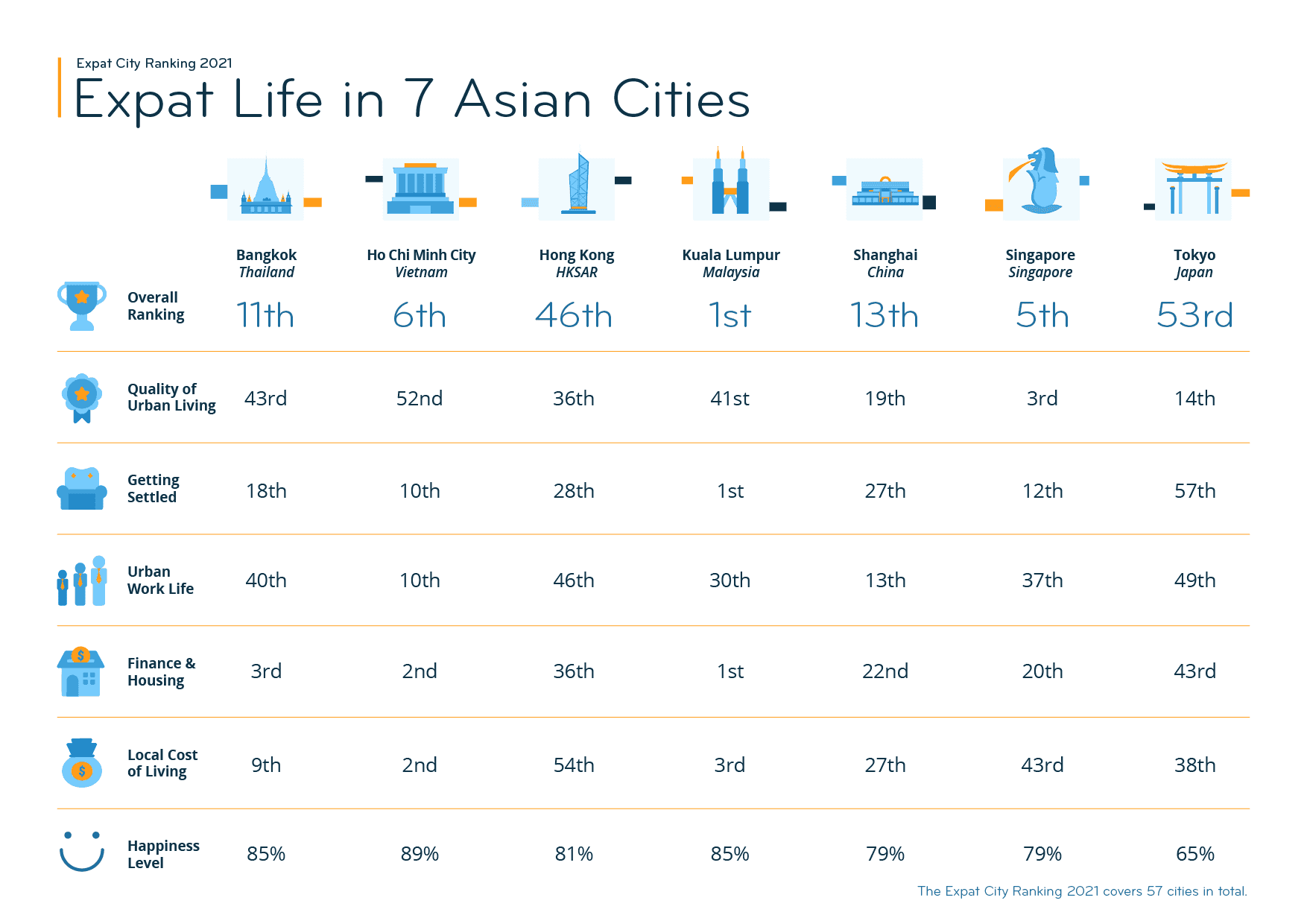 Ranking 46th out of 57, Hong Kong narrowly escapes the bottom 10 of the Expat City Ranking 2021. Among all Asian cities featured in the survey, only Tokyo (53rd) performs worse. Hong Kong’s weakest spot is the Local Cost of Living Index (54th): 78% of expats rate this aspect negatively (vs. 34% globally). This is also reflected in the Housing Subcategory (37th), which is part of the Finance & Housing Index (36th). While 71% say that it is easy for expats to find housing (vs. 60% globally), 89% consider it unaffordable (vs. 39% globally). Hong Kong even comes last for affordable housing (57th). A German expat points out that “the flats are small and expensive”. In the Urban Work Life Index (46th), Hong Kong ranks in the bottom 10 of the Work-Life Balance Subcategory (53rd): 31% of expats are unhappy with their working hours (vs. 16% globally), and 27% rate their work-life balance negatively (vs. 17% globally).