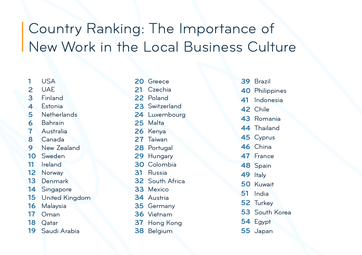 The top 10 countries where expats rate the importance of New Work in the local business culture the highest are the USA, the UAE, Finland, Estonia, the Netherlands, Bahrain, Australia, Canada, New Zealand, and Sweden. For example, 74% of working expats in the USA say that New Work plays an important role in the local business culture.