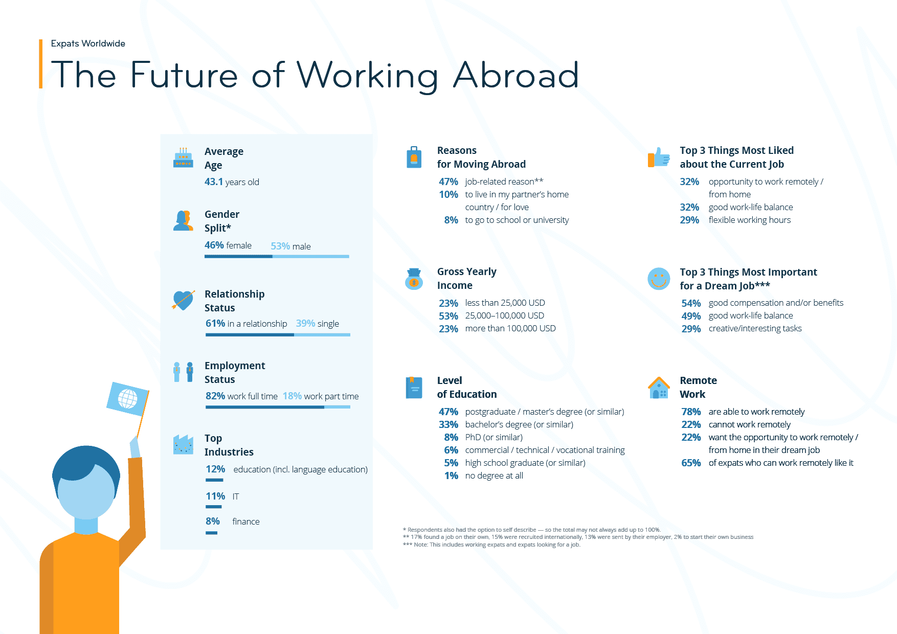 The respondents currently working abroad answered questions to describe their working life, such as their field of work, their employment status, their average working hours, and what they especially appreciate about their job. These questions provide some insights into the status quo of working abroad, but the survey was also aimed at finding out more about how COVID-19 has been transforming the workplace — especially the rise of remote work — and how expats envision their ideal work environment.