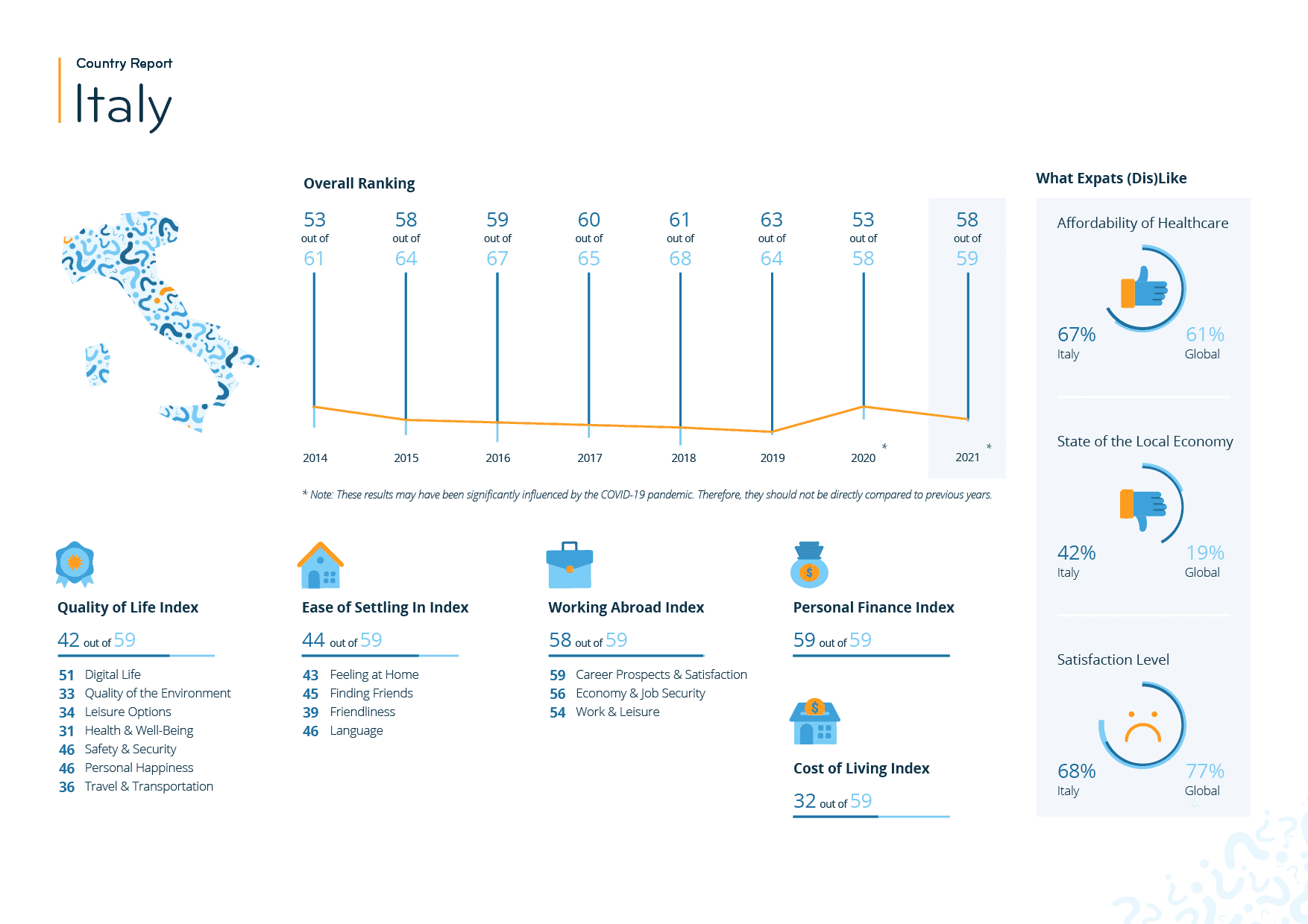 Italy comes 46th in the Safety & Security subcategory, with more than three in ten expats (31%) rating its political stability negatively (vs. 16% globally). The country is also one of the worst destinations when it comes to Personal Happiness (53rd): only 66% of respondents say they are happy with their life in general — which is almost ten percentage points below the global average (75%).