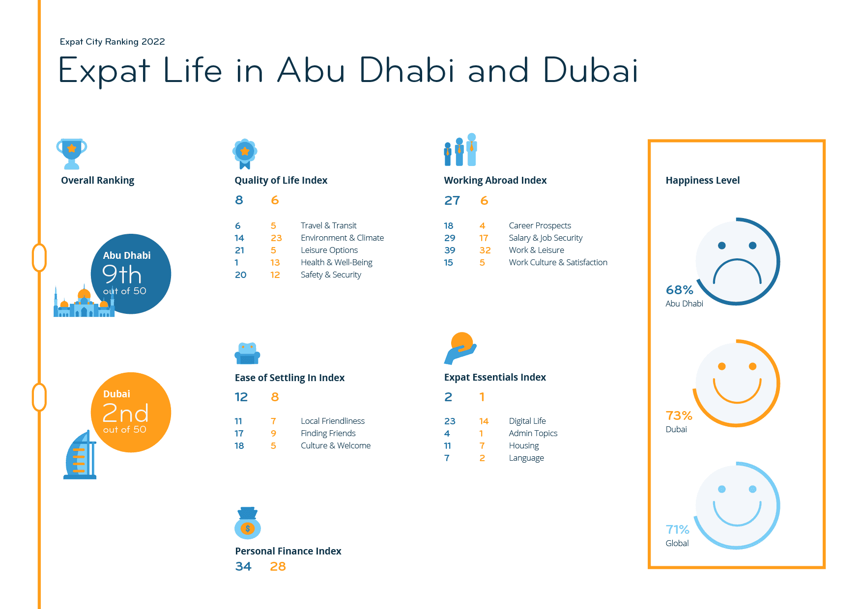 However, while Dubai (6th) excels in the Working Abroad Index, Abu Dhabi only ranks midfield (27th). While three in four expats in Abu Dhabi (75%) feel that moving there has improved their career prospects (vs. 60% globally), 31% feel paid unfairly for their work (vs. 20% globally). Perhaps it could also be connected to the perceived low pay that the city places in the bottom 10 for expats’ satisfaction with their financial situation (43rd), leading to a below-average ranking in the Personal Finance Index (34th).