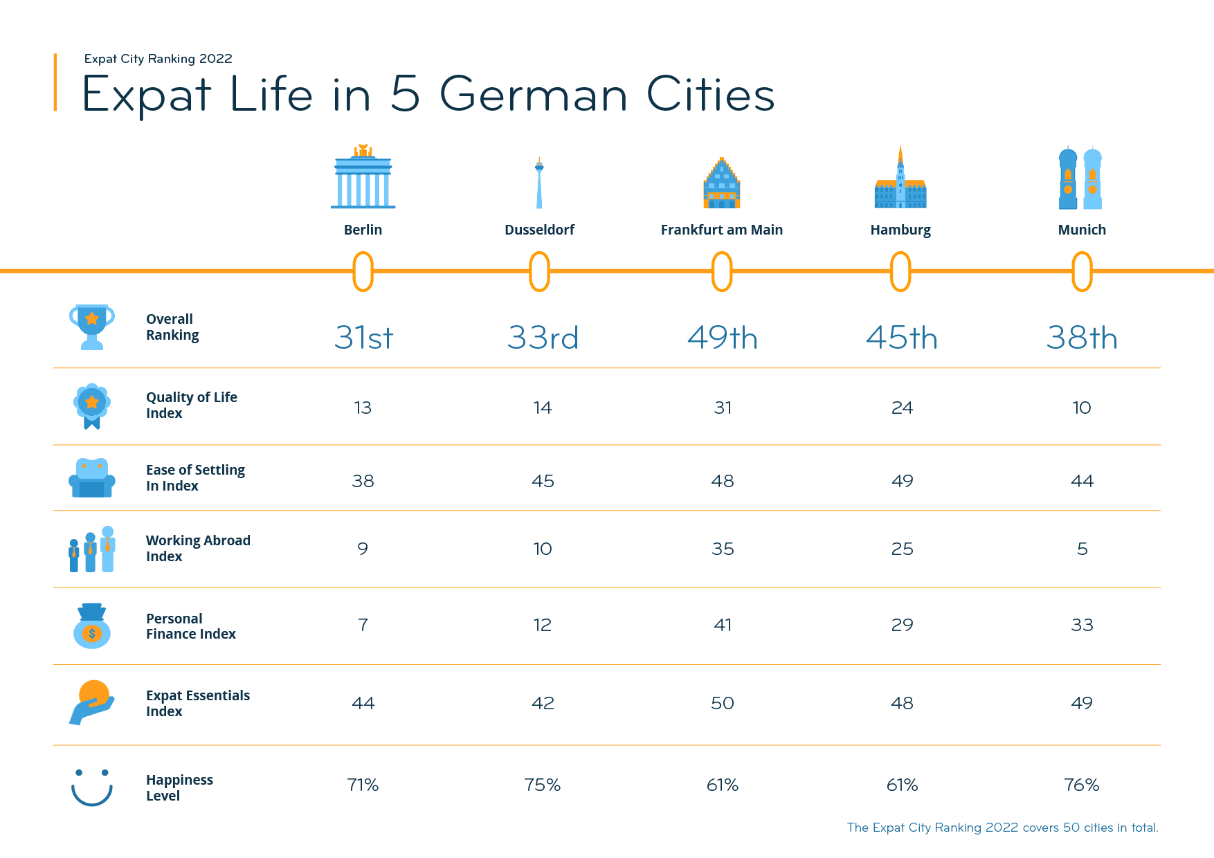 Expats are particularly pleased with their working life, ranking Dusseldorf tenth in the Working Abroad Index. The city comes in eighth for personal career opportunities (69% happy vs. 58% globally), the best result among the five German expat hubs in the ranking. What is more, 80% consider their jobs to be secure (vs. 64% globally), and 70% are satisfied with their jobs in general (vs. 64% globally).