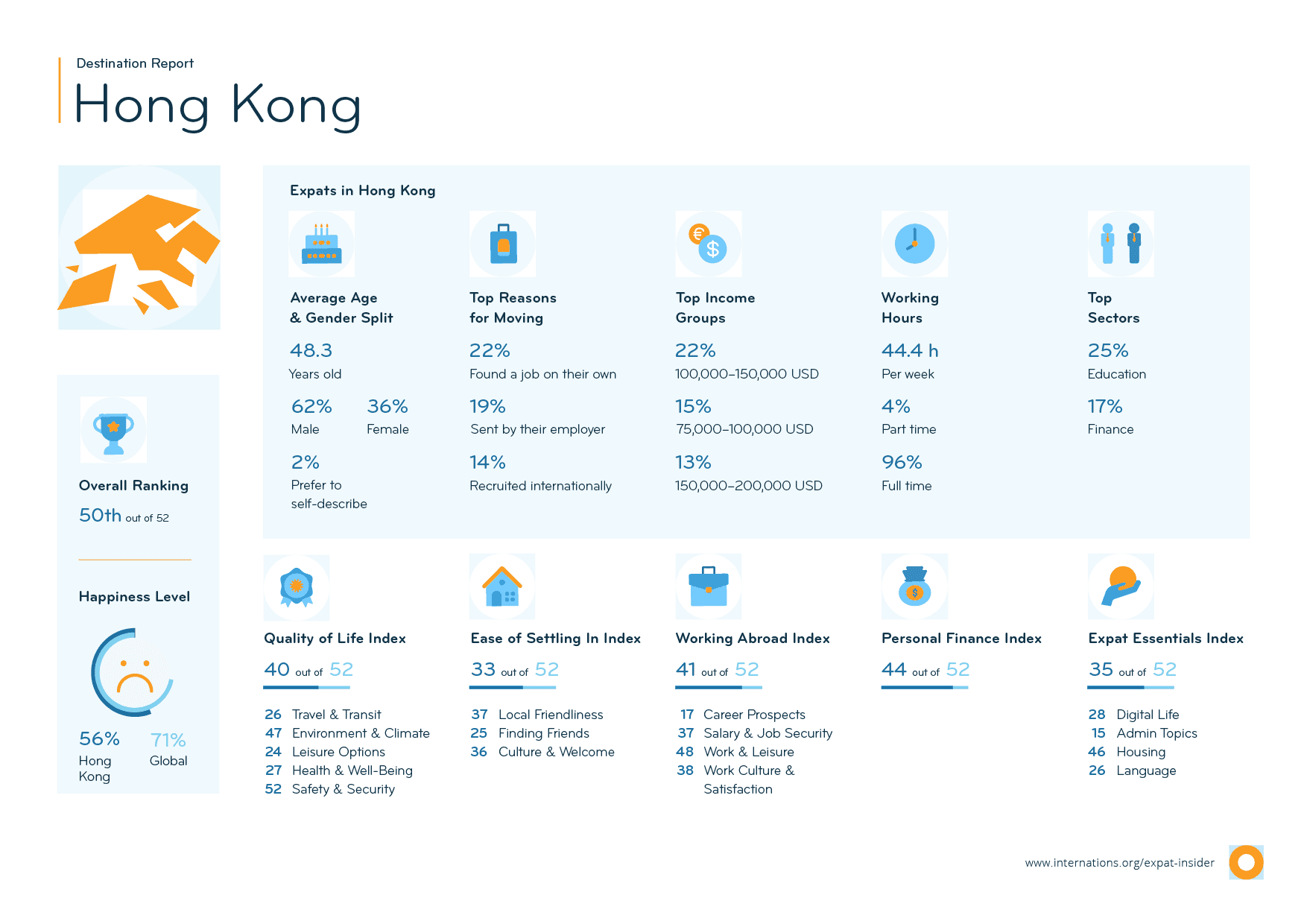 Expats in Hong Kong work more than the average expat, clocking in an average of 44.4 hours per week, compared to 40.2 hours globally. No surprise that Hong Kong ranks among the bottom 3 worldwide for working hours (50th). Expats most commonly work in the field of education (25% vs. 11% globally), and 70% find that moving to Hong Kong has improved their career prospects (vs. 60% globally). However, close to half (46%) feel that the local business culture does not encourage creativity or thinking outside of the box, compared to only 26% globally, and 38% are unhappy with the state of the local economy (vs. 17% globally).