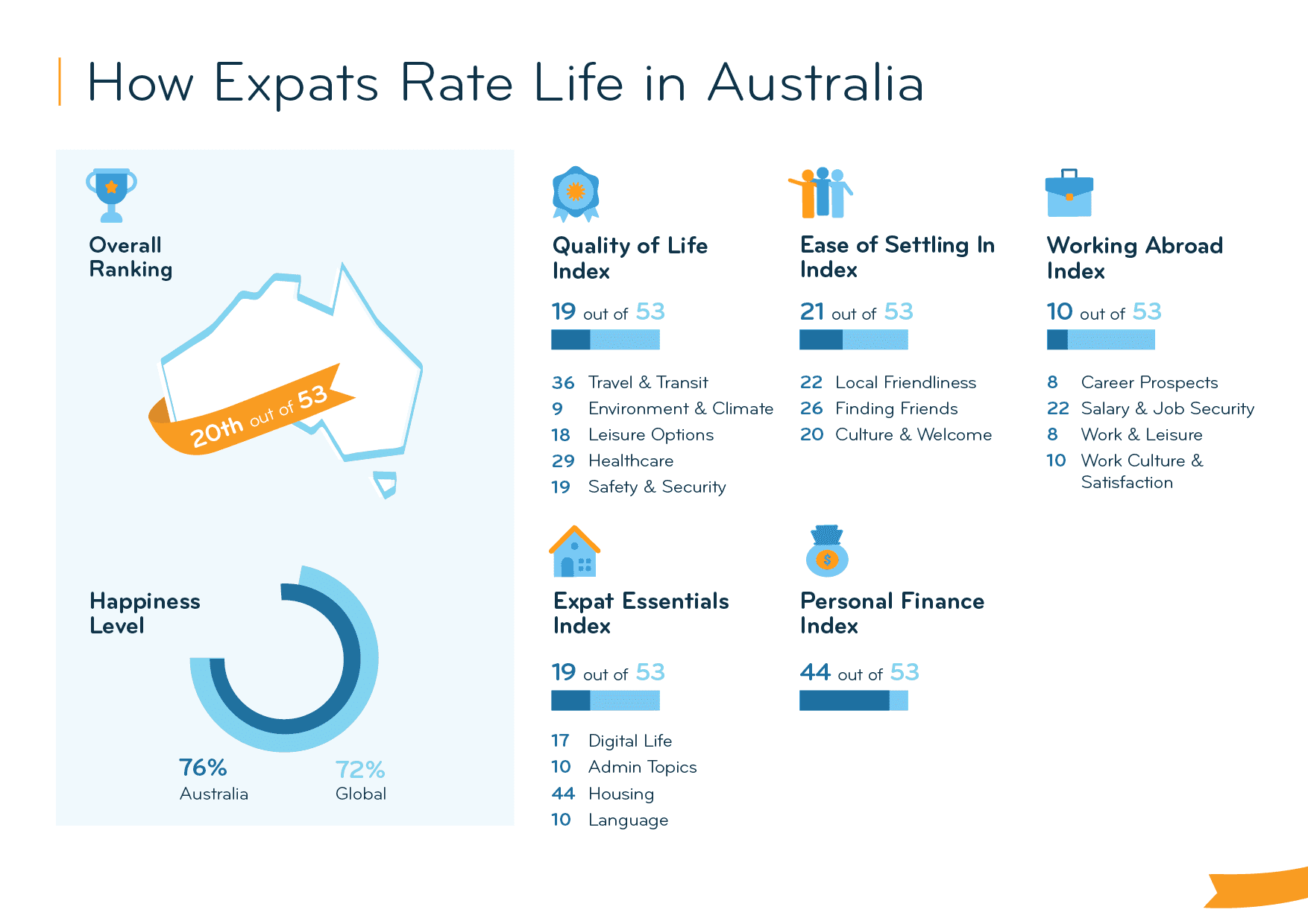 Expats praise working life in Australia, voting the country 10th in the Working Abroad Index. They are especially satisfied with their Career Prospects (8th): Australia ranks 2nd for its job market. Nearly two in three expats (64%) are happy with their personal career opportunities there (vs. 57% globally).