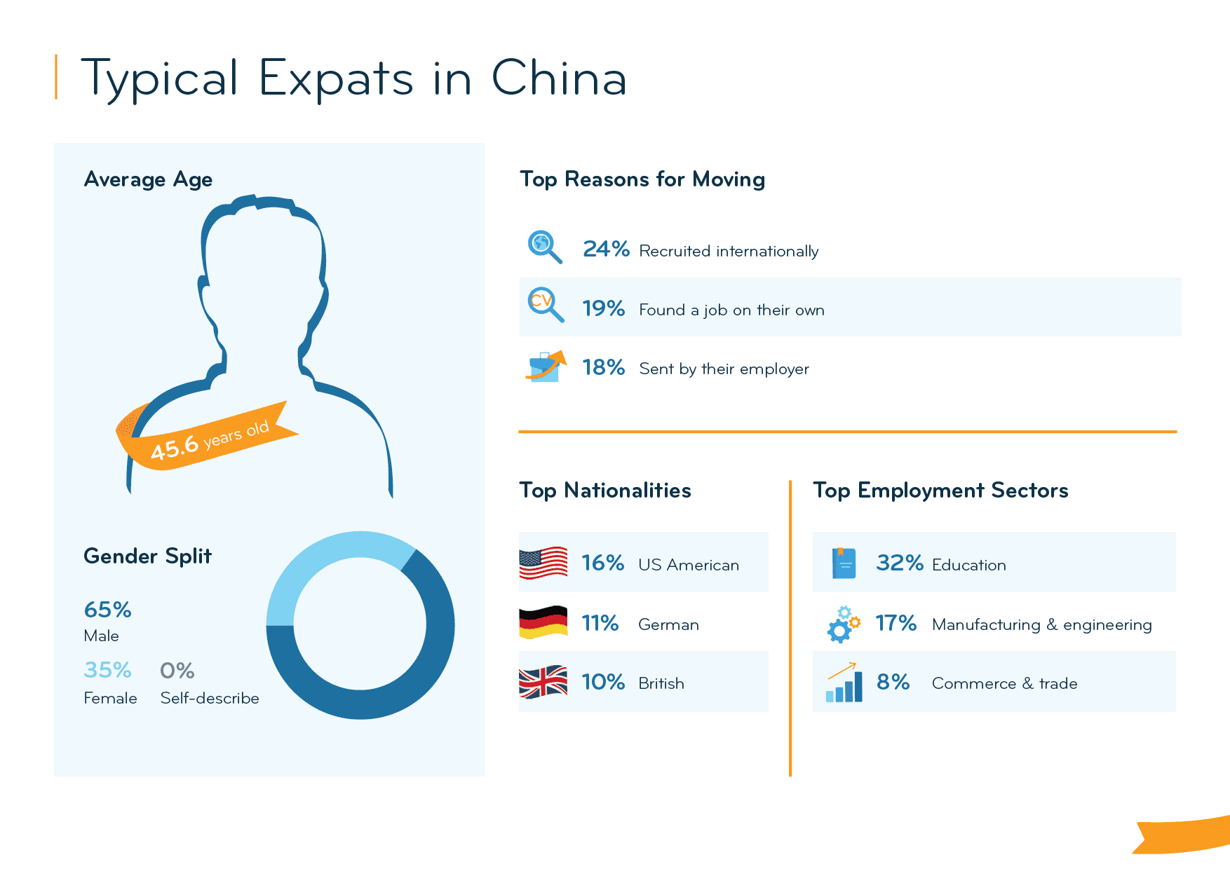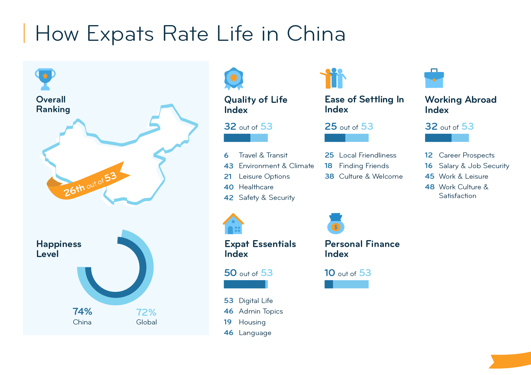 However, expats struggle with the Environment & Climate (43rd). In fact, three in ten (30%) rate the air quality poorly (vs. 17% globally). And although 94% feel safe in China (vs. 83% globally), more than half (54%) say that they cannot openly express themselves, more than triple the global average of 15%. In the Ease of Settling In Index (25th), expats also struggle at times. It can be hard to get used to the local culture (44th), but at least they still have a personal support network in China (6th).