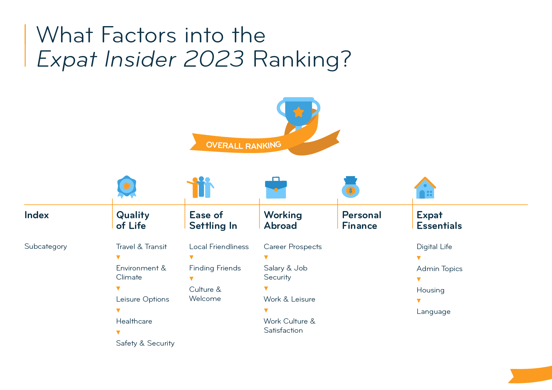 It is important to note that the ratings are a comparison of how satisfied survey respondents are with various aspects of life in their respective destination. They are not an objective comparison of verified facts from external sources. For example, the factor “personal safety” measures how safe expats feel in their respective destination, but it does not refer to actual crime rates provided by that country’s law enforcement authorities.