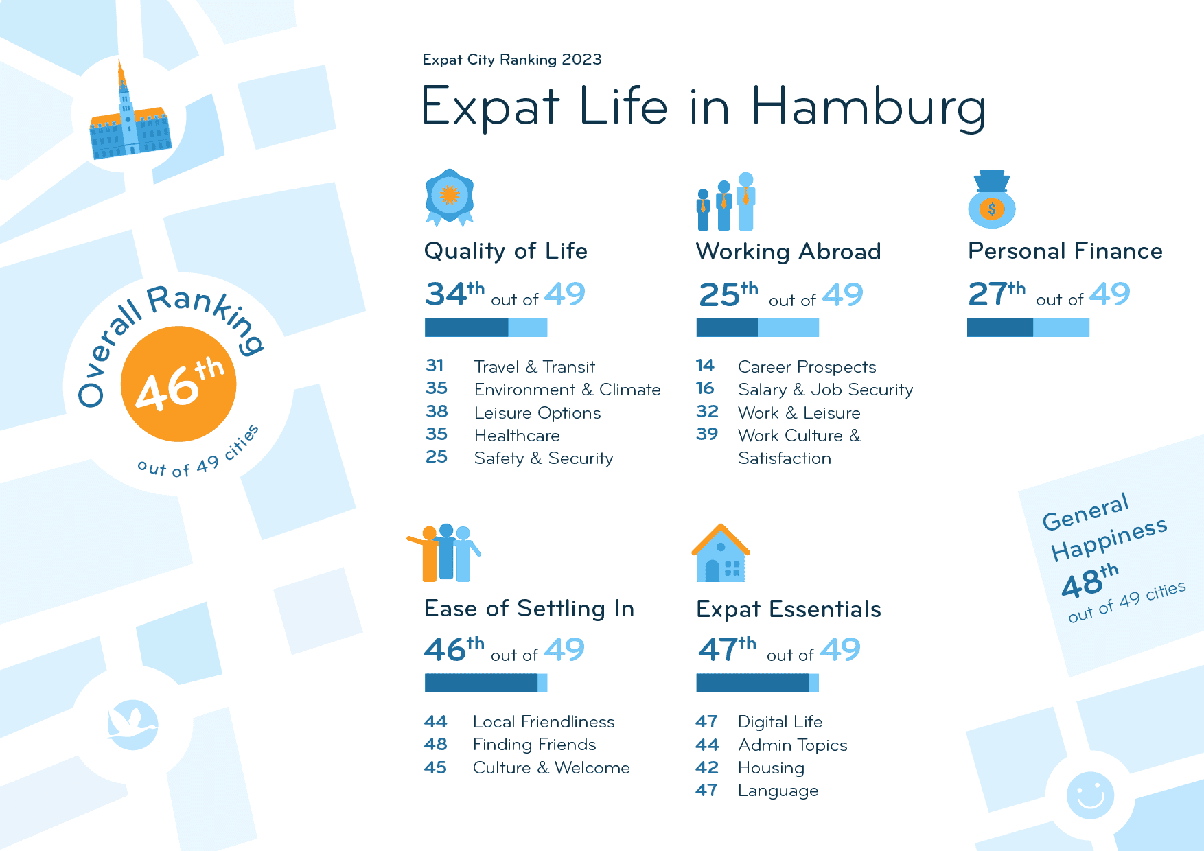 Hamburg comes 46th out of 49 in the Expat City Ranking 2023. And it’s the place where expats feel the second unhappiest overall (48th). Only Vancouver does worse. A shocking 41% aren’t satisfied with their social life (vs. 25% globally), and 35% don’t have a personal support network (vs. 24% globally). Close to three in five (61%) also say it’s hard to make local friends (vs. 36% globally), leaving Hamburg in the bottom 5 of the Ease of Settling In Index (46th).