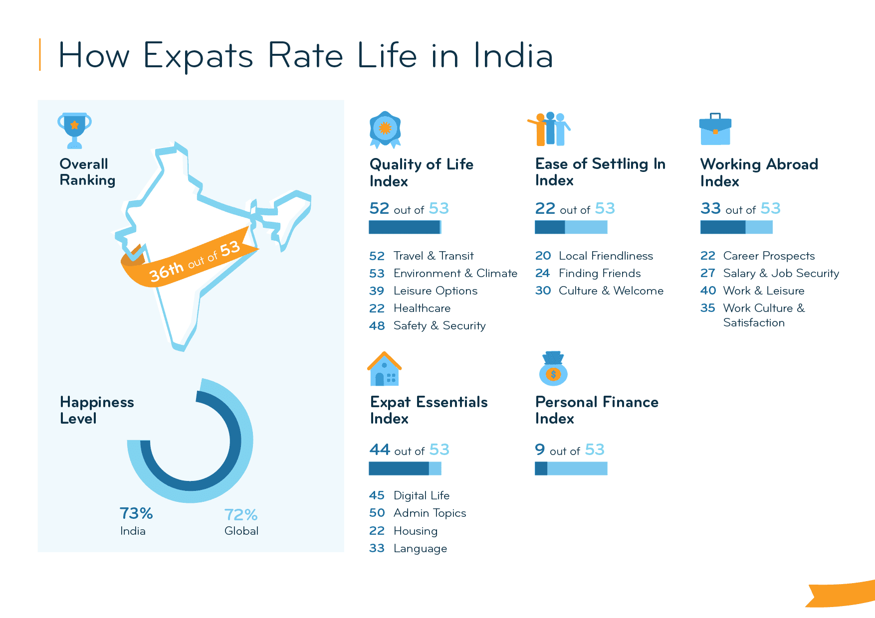 India comes 36th out of 53 destinations in the Expat Insider 2023 survey. For the tenth year in a row, it is one of the worst-rated destinations in the Quality of Life Index (52nd). It also lands among the bottom 10 in the Expat Essentials Index (44th), which is mainly due to expats’ low satisfaction with Digital Life (45th) and Admin Topics (50th). While the country only does somewhat better in the Working Abroad Index (33rd), it lands in a solid 22nd place in the Ease of Settling In Index. In the Personal Finance Index, India even ranks 9th. Overall, 73% of expats are happy with their life in India, about the same as the global average (72%).