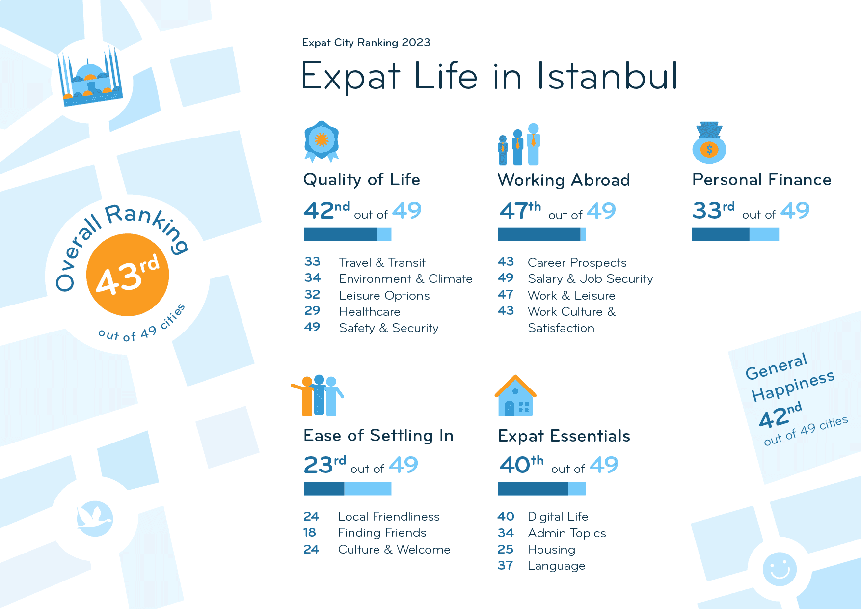Istanbul places 43rd out of 49 in the Expat City Ranking 2023. Expats struggle when it comes to the local Quality of Life (42nd): they don’t feel safe getting around on foot or by bicycle (41st), and they are unhappy with the urban environment (40th).