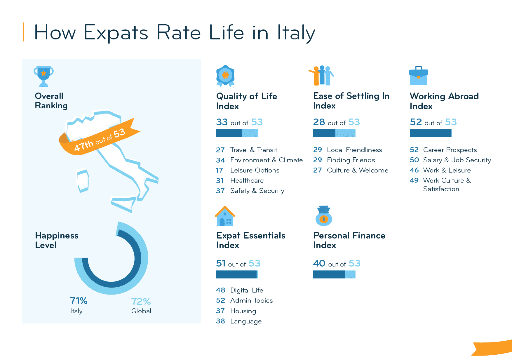 Italy comes 47th out of 53 destinations in the Expat Insider 2023 survey. Expats struggle with their working life, especially their career prospects and the business culture. Frustrating bureaucracy, a lack of digitalization, and a below-average financial situation lead to Italy’s rank among the bottom 10. Overall, 71% of expats are happy with their life in Italy, compared to 72% globally.