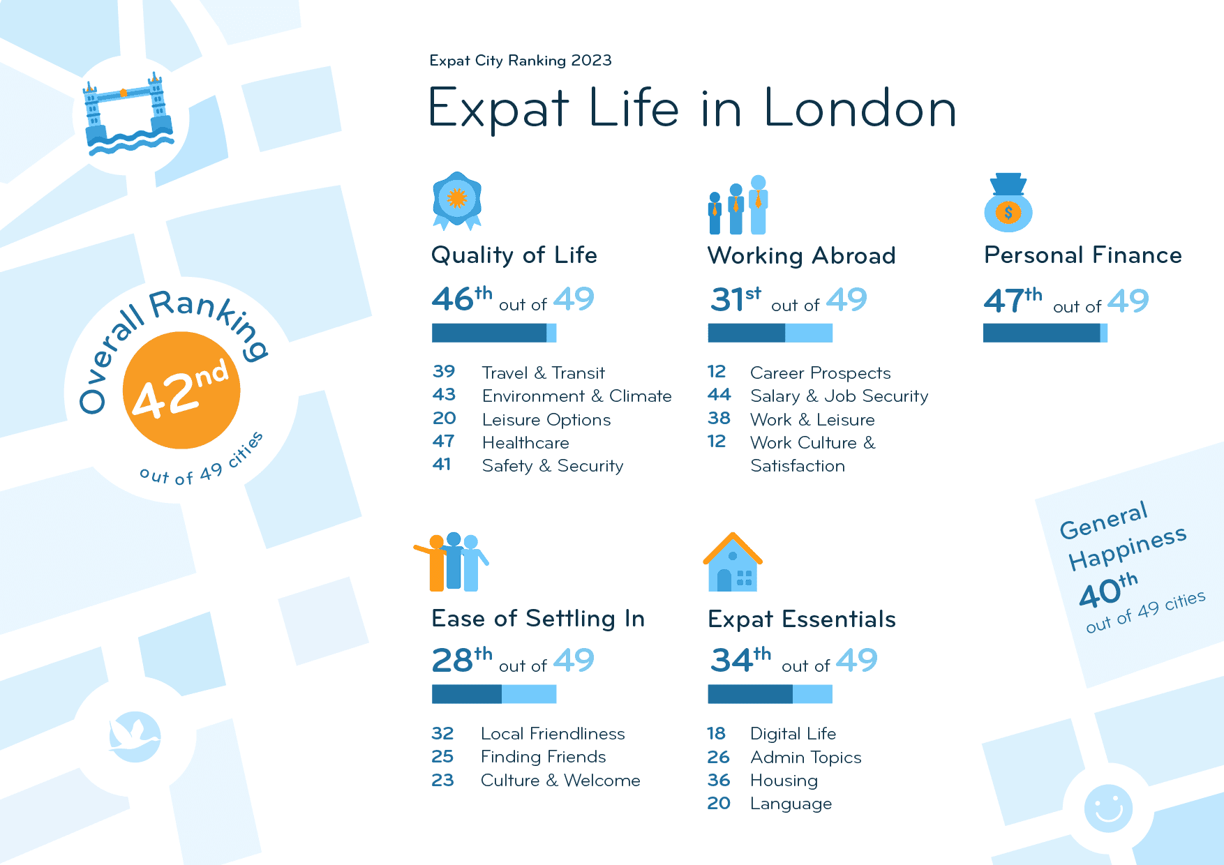 London comes 42nd out of 49 cities in the Expat City Ranking 2023. Expats in the UK capital struggle in many different ways, and the high cost of living doesn’t help. Difficulties with the healthcare system and frustrations with public transportation add additional worries. Overall, 69% of expats are happy with their life in London, compared to 72% globally.