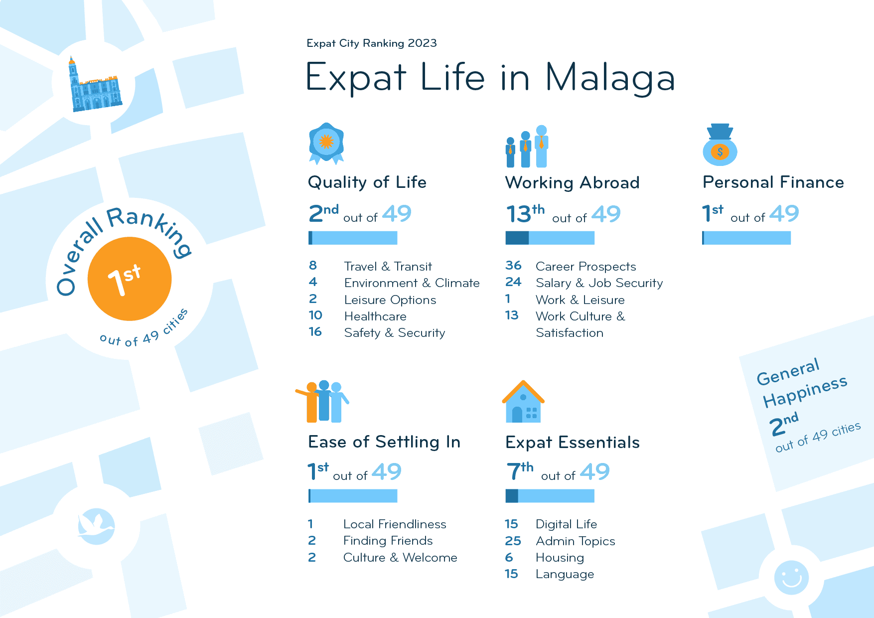 Málaga places 1st out of 49 in the Expat City Ranking 2023. Respondents also rate it the best city worldwide for Local Friendliness (1st): 89% say that the locals are particularly friendly towards foreign residents (vs. 65% globally). It’s maybe not surprising, then, that the Spanish city also ranks 2nd for Finding Friends.