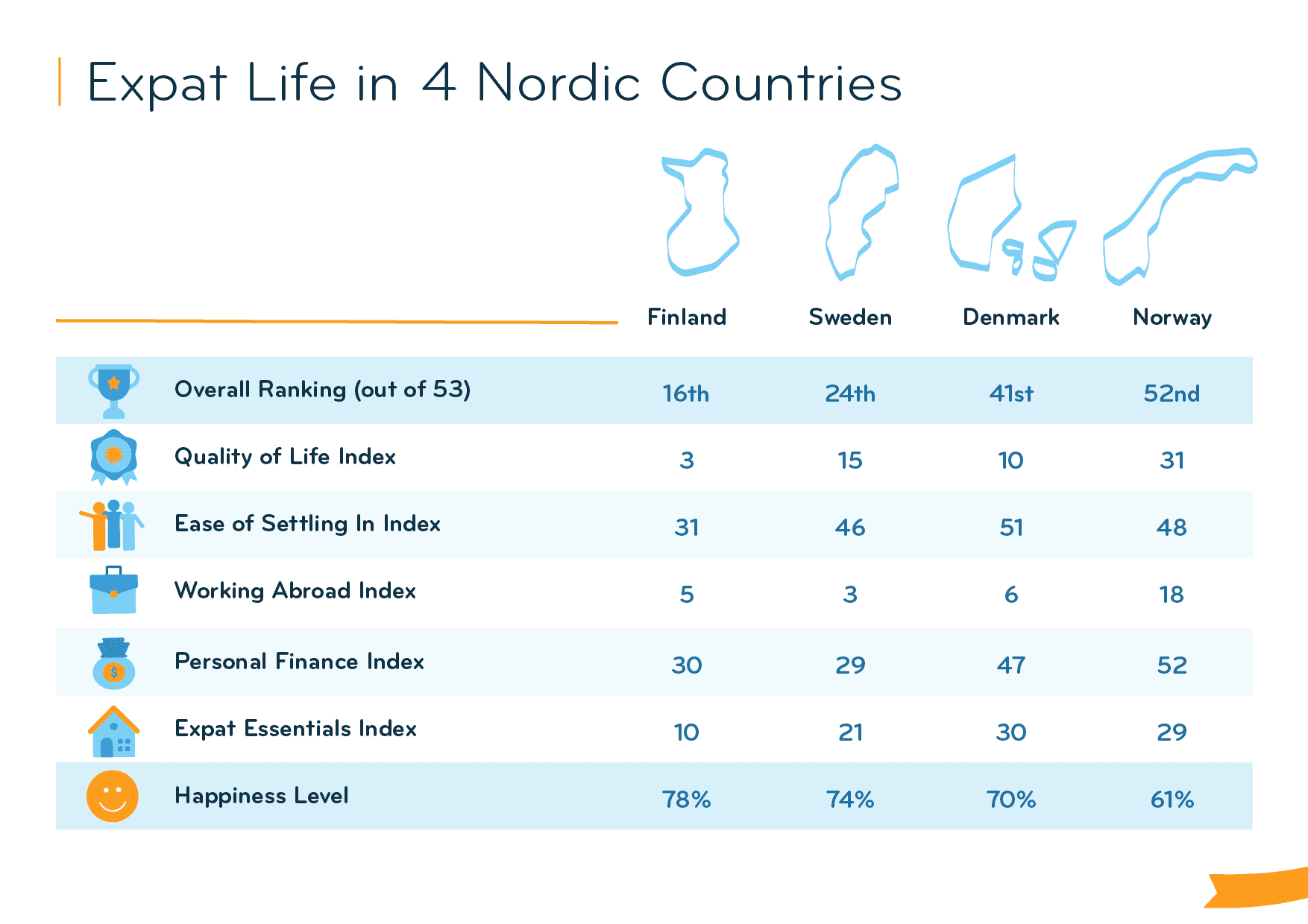 Finland ranks 16th out of 53 destinations in the Expat Insider 2023 survey, followed by Sweden (24th), Denmark (41st), and Norway (52nd). While each country has its own strengths and weaknesses, they also show some similarities. For example, in the Quality of Life Index they all rank in the top 10 worldwide for air quality but in the bottom 10 for both the culinary variety and dining options as well as culture and nightlife.