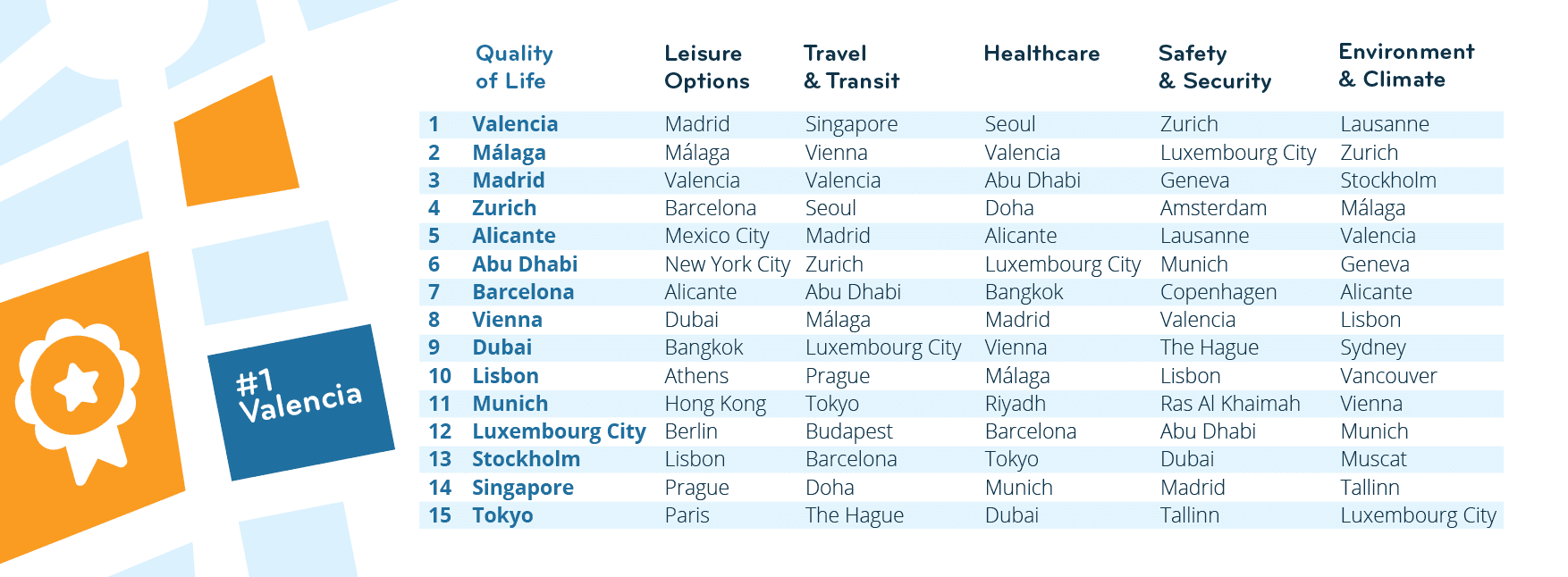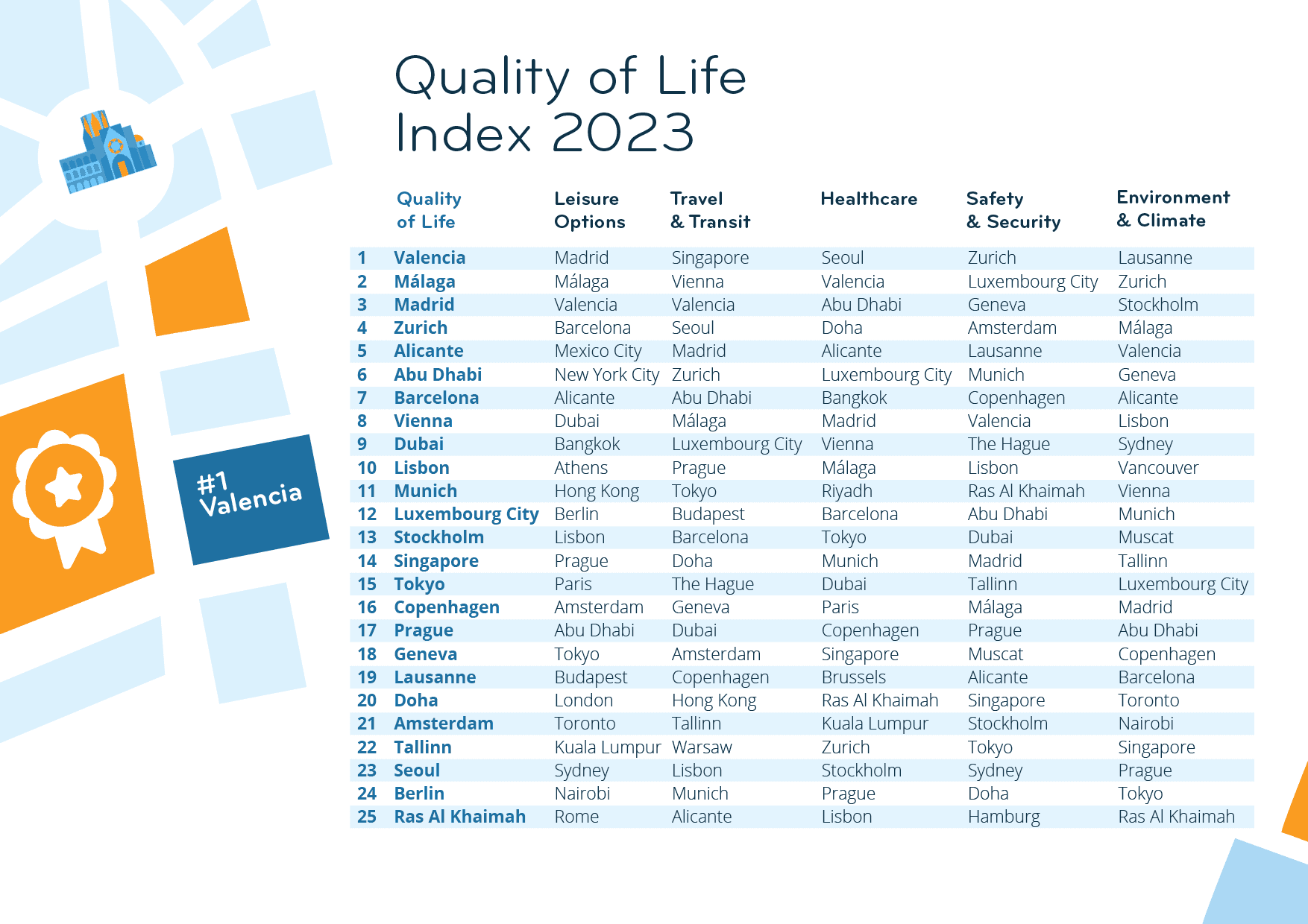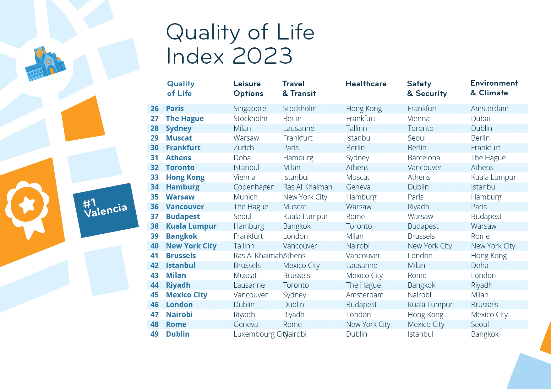 The highest-rated destination in the Quality of Life Index (1st), Valencia lands among the top 10 in all five subcategories, too. It does best in the Healthcare Subcategory (2nd), where it ranks very well for the affordability (1st), availability (3rd), and quality of medical care (4th).