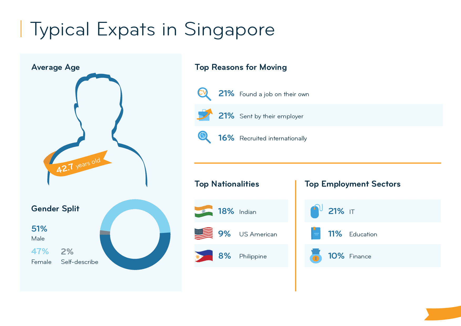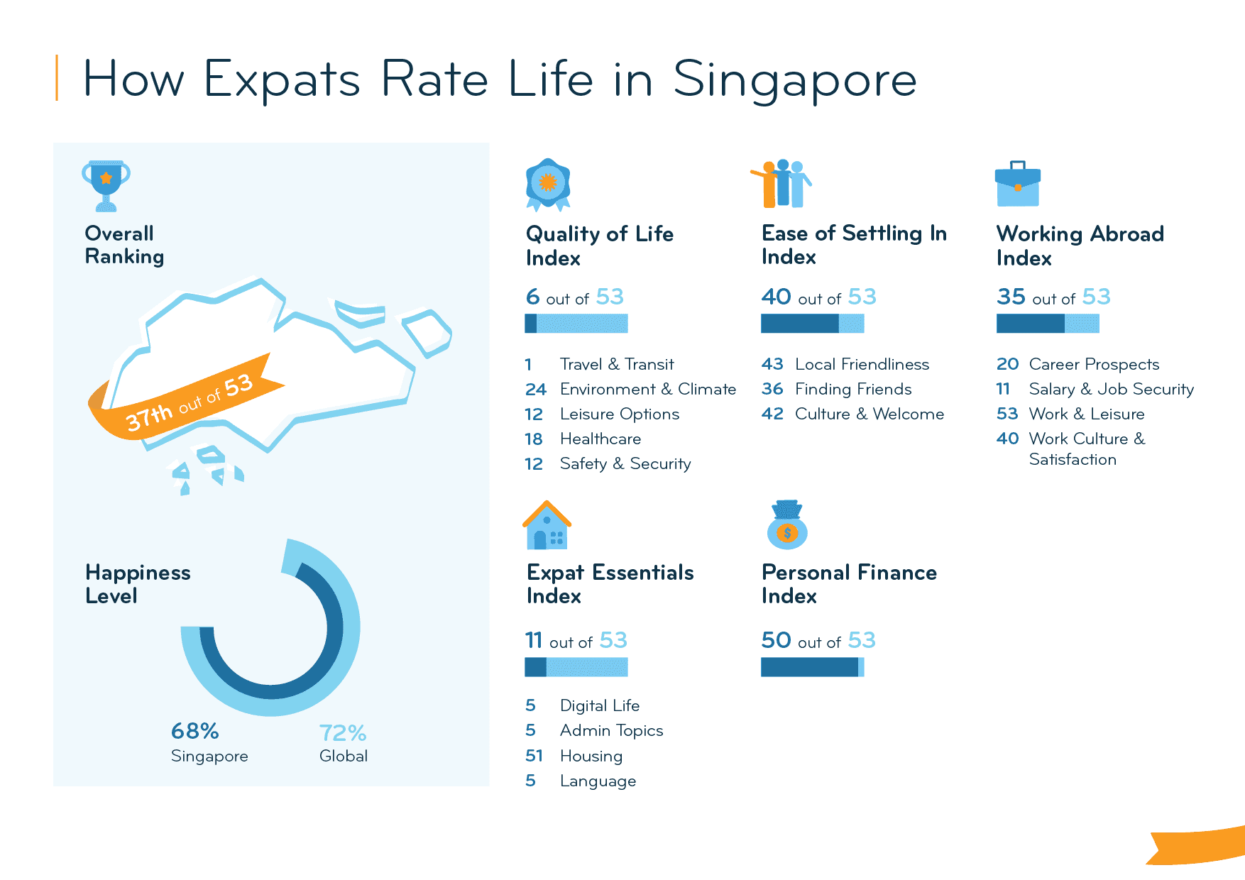 Singapore comes 37th out of 53 destinations in the Expat Insider 2023 survey. It performs best in the Quality of Life (6th) and Expat Essentials (11th) Indices. In the latter, it comes 5th for Digital Life, Admin Topics, and Language, but only 51st for Housing. While Singapore ranks somewhat below average in the Working Abroad (35th) and Ease of Settling In (40th) Indices, it even lands among the bottom 5 destinations for Personal Finance (50th). Expats are particularly unhappy with the general cost of living (53rd), which has been an ongoing challenge. Overall, 68% of expats are happy with their life in Singapore, compared to 72% globally.