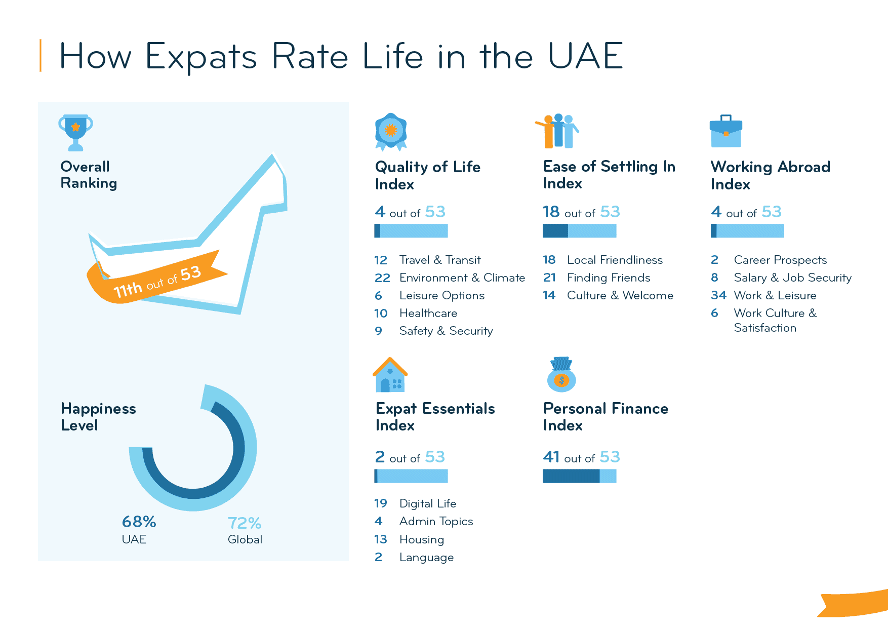 The Working Abroad Index (4th) is another area where the UAE performs very well, particularly in the Career Prospects Subcategory (2nd). Only the USA (1st) does better here. Expats in the UAE are happy with their personal career opportunities (64% vs. 57% globally). Another 77% say that moving there has improved their career prospects (vs. 59% globally).