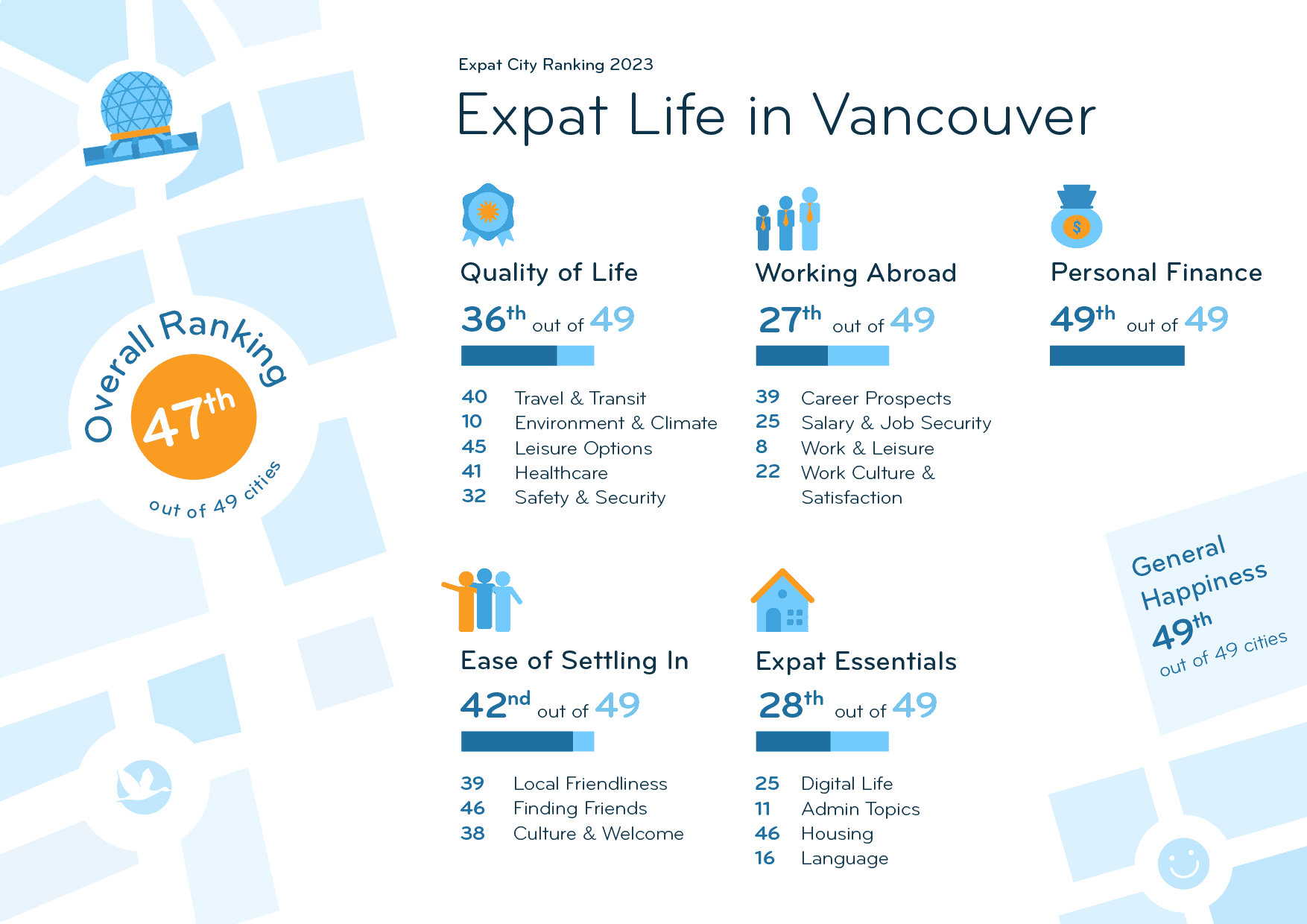 Vancouver comes 47th out of 49 in the Expat City Ranking 2023 — and it’s the place where expats feel unhappiest (49th). A shocking 35% aren’t satisfied with their social life (vs. 25% globally), and 39% don’t have a personal support network (vs. 24% globally). Close to three in five (59%) also say it’s hard to make local friends (vs. 36% globally), leaving Vancouver in the bottom 10 of the Ease of Settling In Index (42nd).