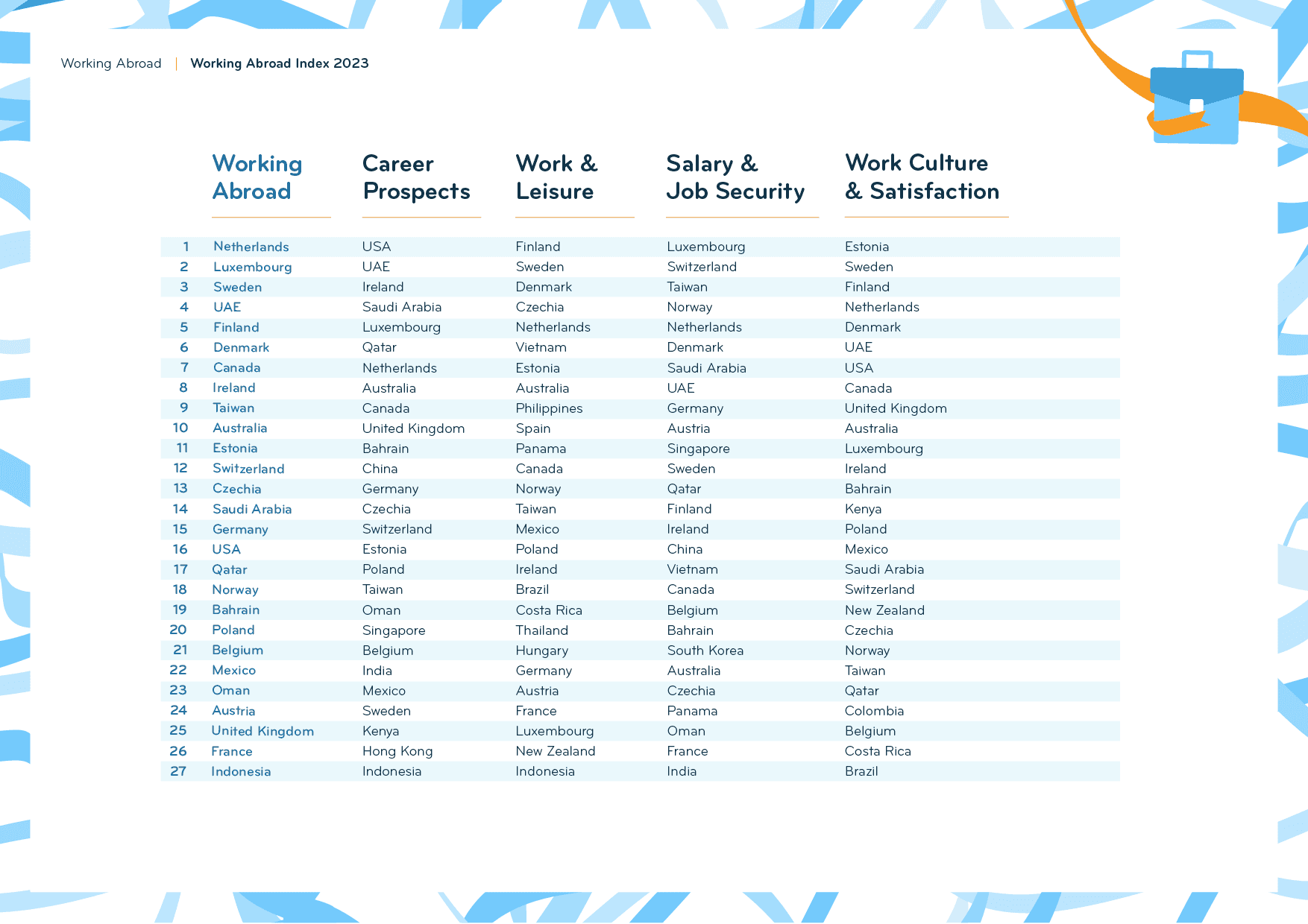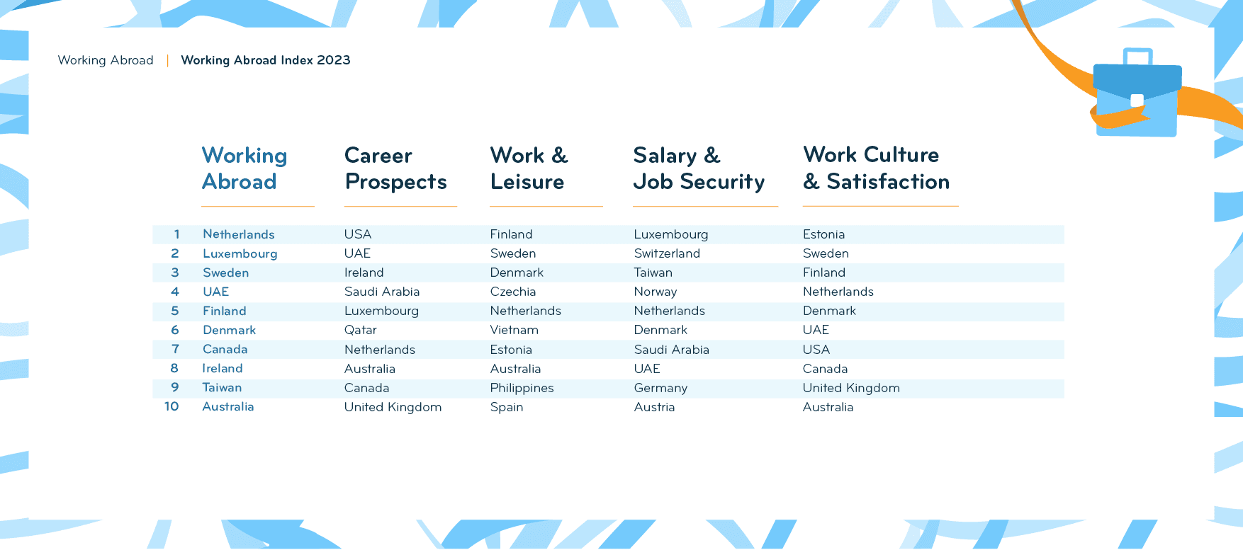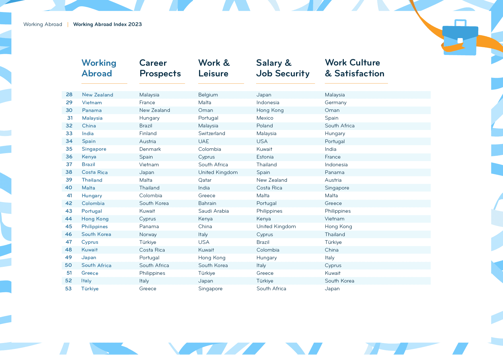 The Working Abroad Index of the Expat Insider 2023 survey features 53 destinations worldwide with a sample size of at least 50 respondents each. Its results are based on four subcategories: Career Prospects, Salary & Job Security, Work & Leisure, and Work Culture & Satisfaction. Each subcategory consists of two to five single factors each that were rated on a scale of one (very bad) to seven (very good).