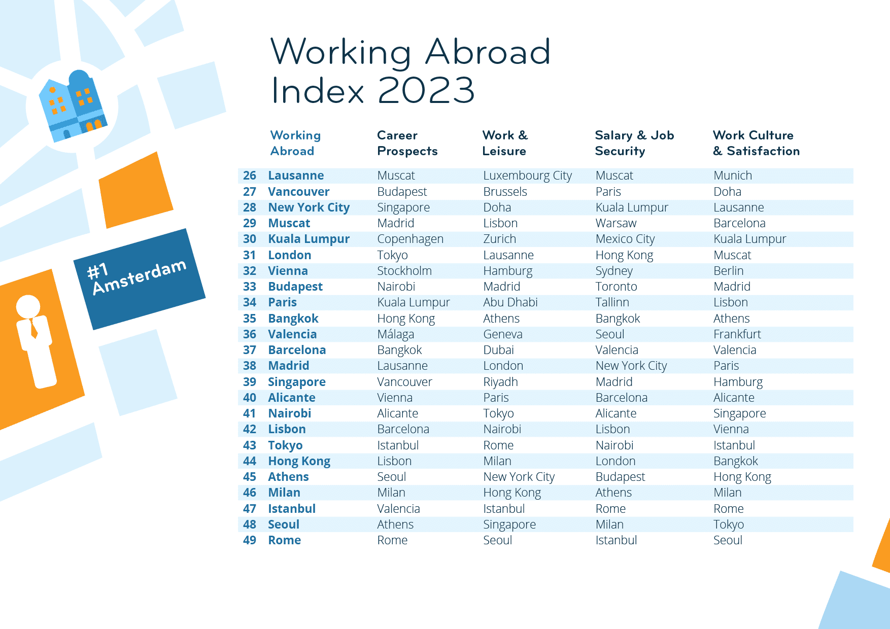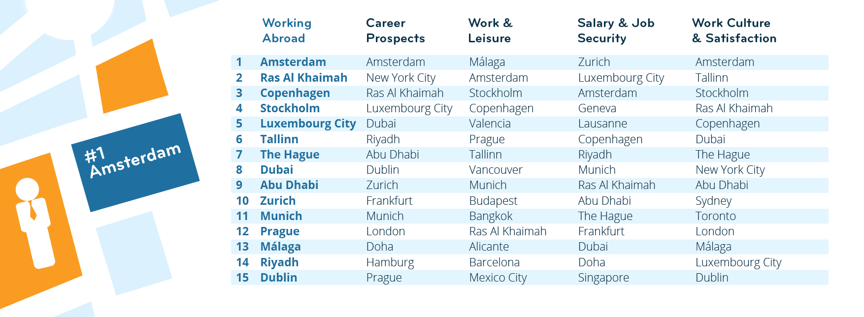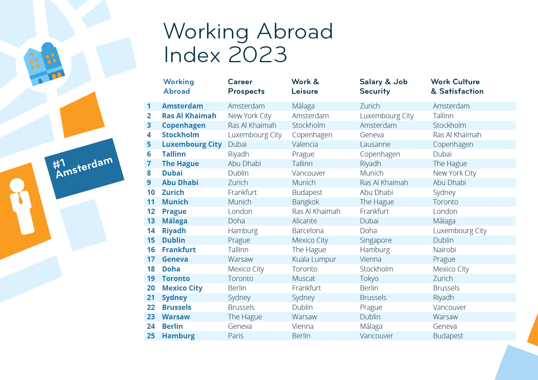 With a 1st place out of 49 cities in the Working Abroad Index 2023, Amsterdam has further improved its already good performance of the previous year (7th out of 50). In fact, it makes it into the top 3 of all four subcategories of the index — great news for the above-average share of expats who moved there for their job (46% vs. 35% globally)!