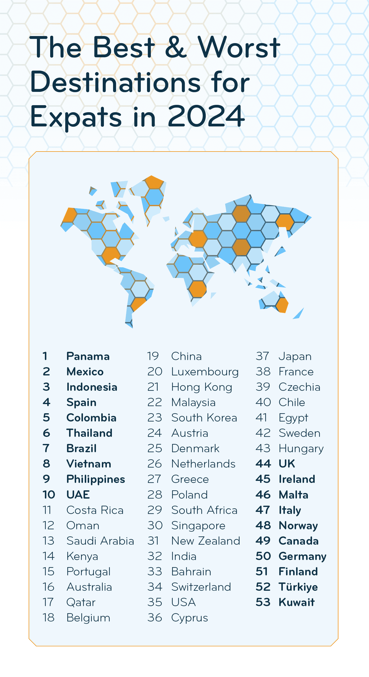 The four Southeast Asian countries in the top 10 — Indonesia (3rd), Thailand (6th), Vietnam (8th), and the Philippines (9th) — paint a very similar picture. Expats love them for the Ease of Settling In (from Vietnam’s 13th place to the Philippines’ 3rd) and their Personal Finances (from Thailand’s 8th place to Vietnam’s 1st).