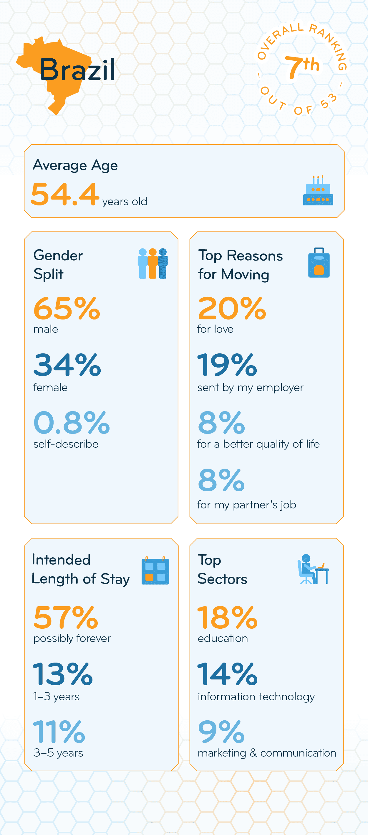 Brazil’s challenges lie within Admin Topics (35th) and Language (39th). Dealing with official procedures can be somewhat cumbersome, as 46% of expats find it difficult to deal with the local bureaucracy (vs. 42% globally). The language barrier doesn’t make it any easier: 58% of expats don’t find it easy to get by without speaking the local language (vs. 33% globally). At least learning Portuguese isn’t impossible (23rd).