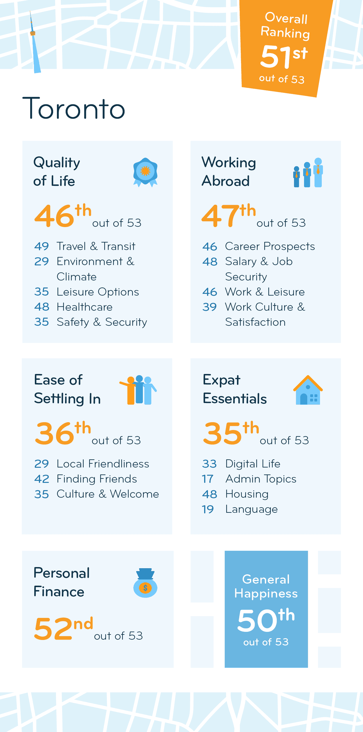 Toronto’s results in the Expat Essentials (35th) and Ease of Settling In (36th) Indices aren’t as bad — but still nothing to write home about. Two in five expats (40%) are unhappy with their social life in the city (vs. 29% globally), while the affordability of housing (51st) remains a major concern.