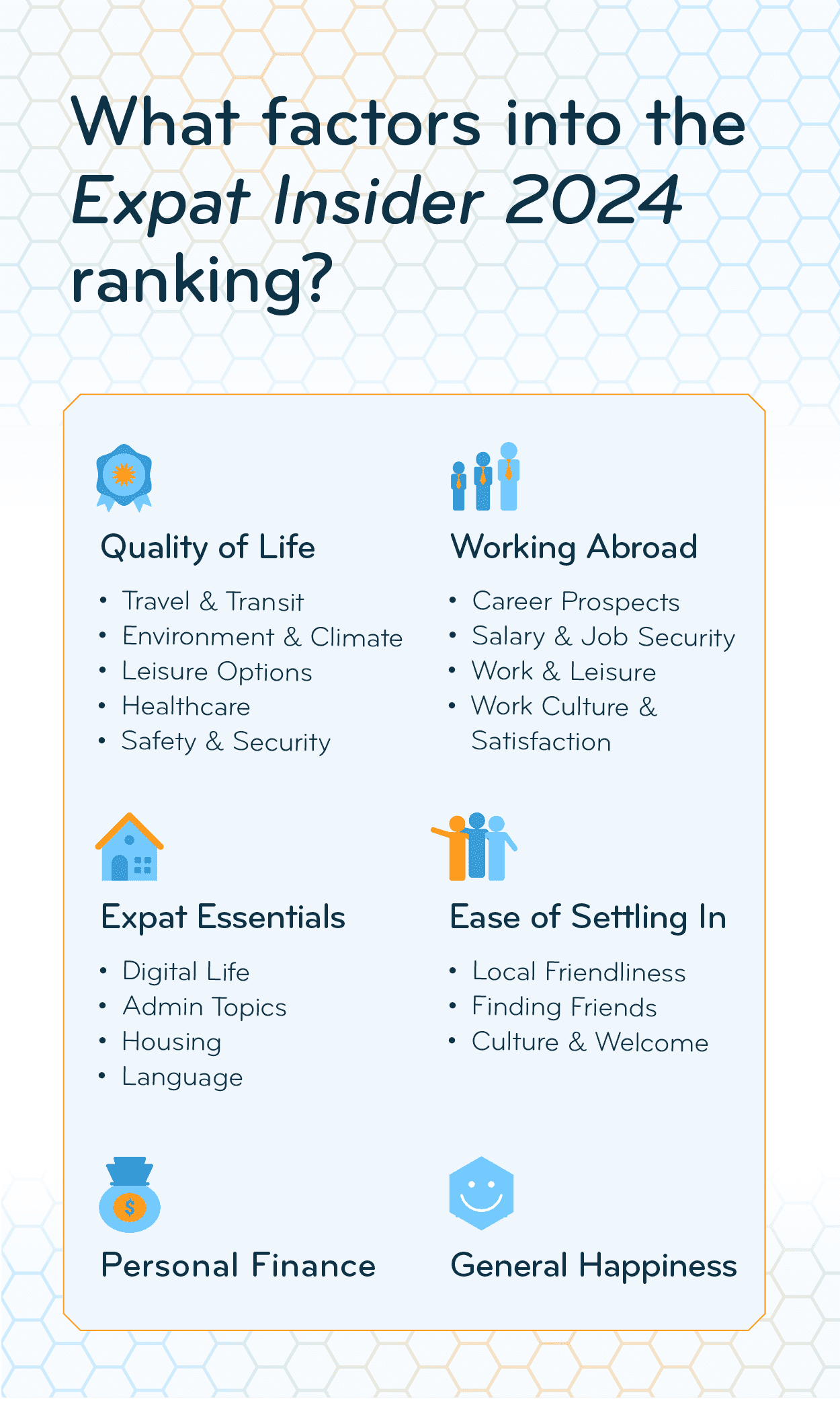 The results are published in the form of an overall Expat City Ranking and five topical indices: Quality of Life, Ease of Settling In, Working Abroad, Personal Finance, and Expat Essentials.