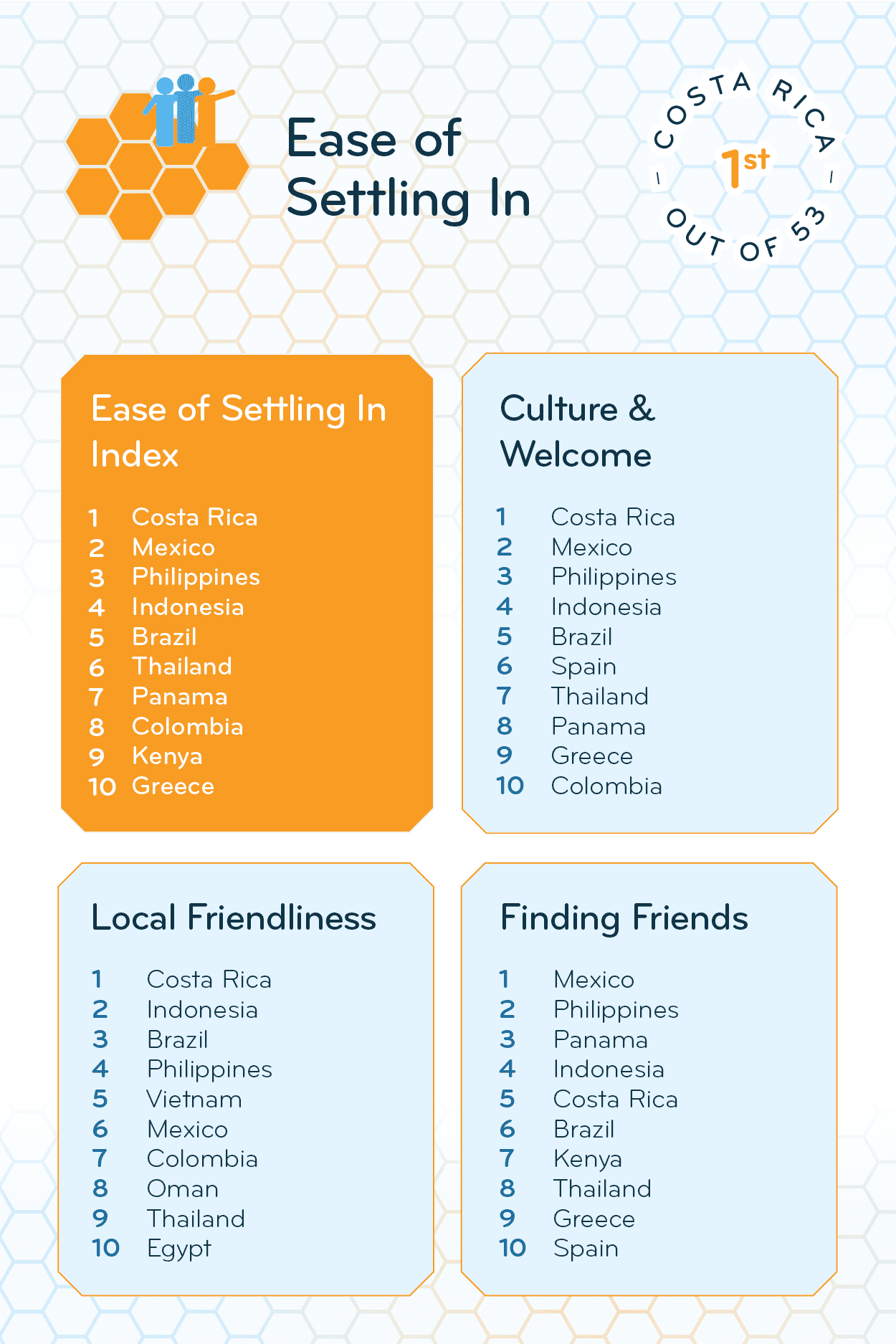 Half of the top 10 of the Ease of Settling In Index can be found in Central and South America: Brazil (5th), Panama (7th), and Colombia (8th) join Costa Rica (1st) and Mexico (2nd).