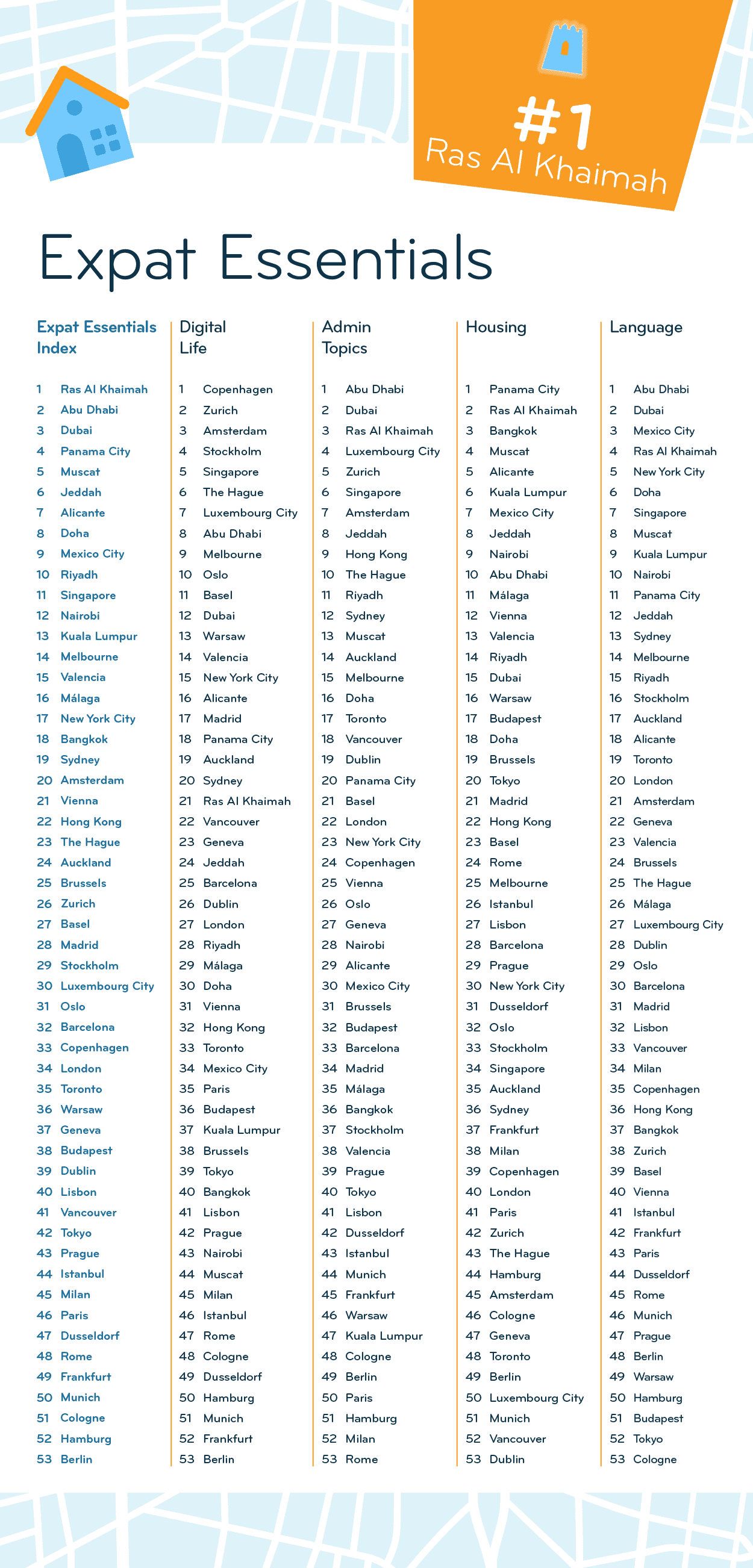 The top 10 of the Expat Essentials Index is mostly populated by cities in the Middle East. Muscat (5th), Jeddah (6th), Doha (8th), and Riyadh (10th) join Ras Al Khaimah (1st), Abu Dhabi (2nd), and Dubai (3rd).