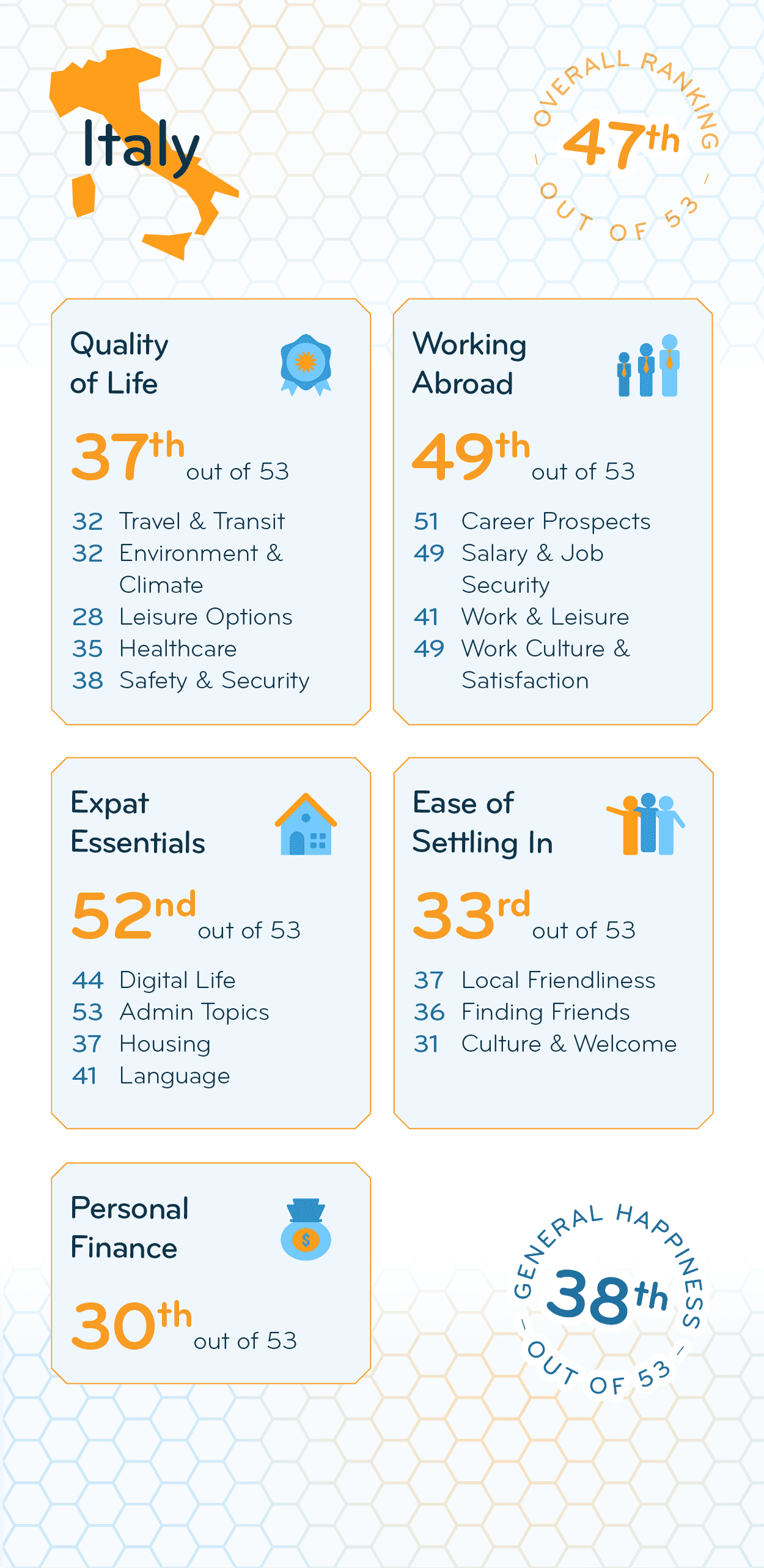 Consistent with last year’s results, Italy ranks 47th out of 53 countries in the Expat Insider 2024 survey. The low ranking reflects Italy’s challenges in the Working Abroad (49th) and Expat Essentials (52nd) Indices, particularly for Career Prospects (51st) and Admin Topics (53rd). These are potential obstacles expats may face when considering Italy as their destination.