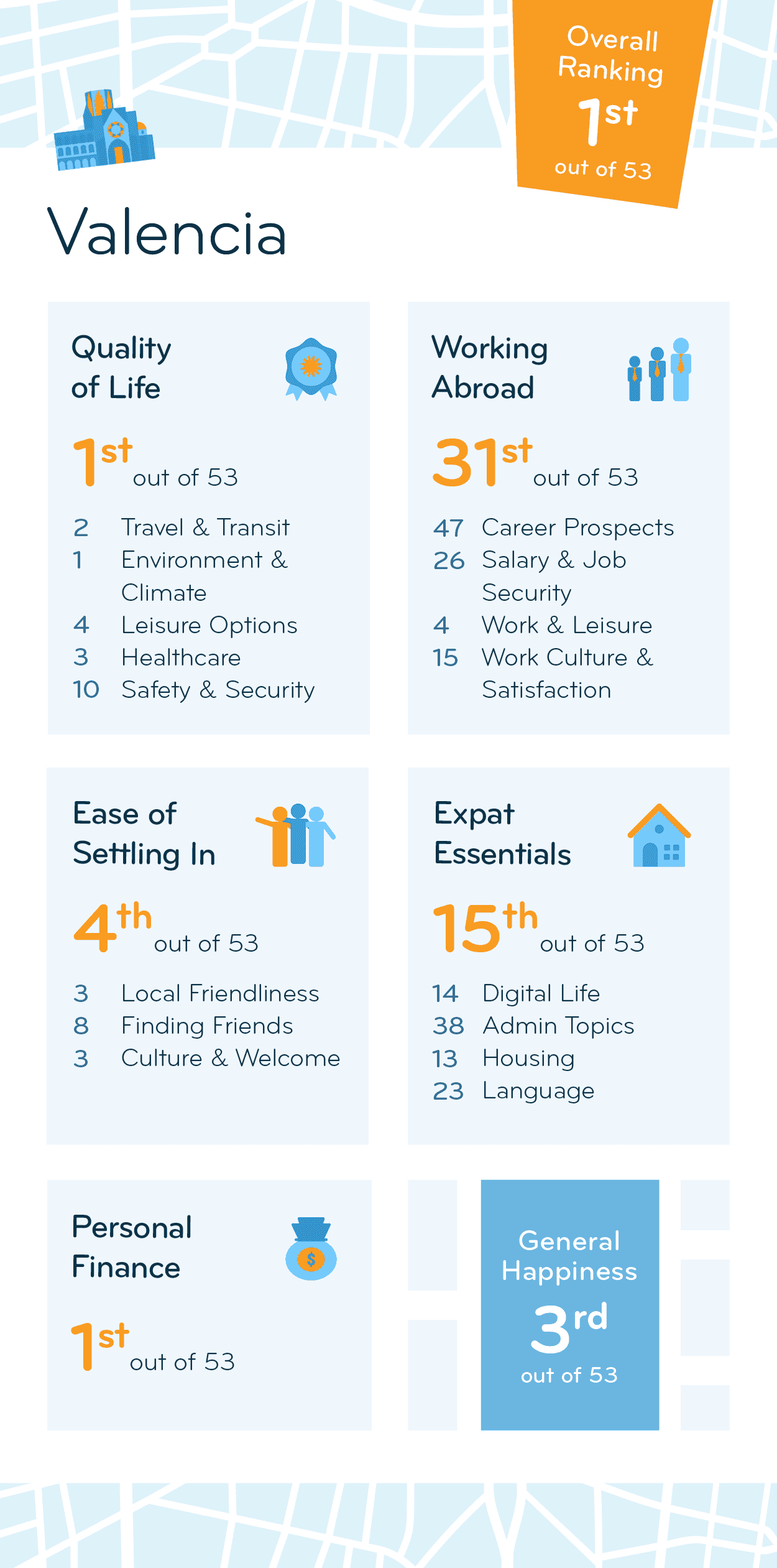 After a minor slip to 3rd place in 2023, Valencia returns to 2022 form by regaining 1st place in the 2024 Expat City Ranking. It also ranks 1st in the Quality of Life and Personal Finance Indices.