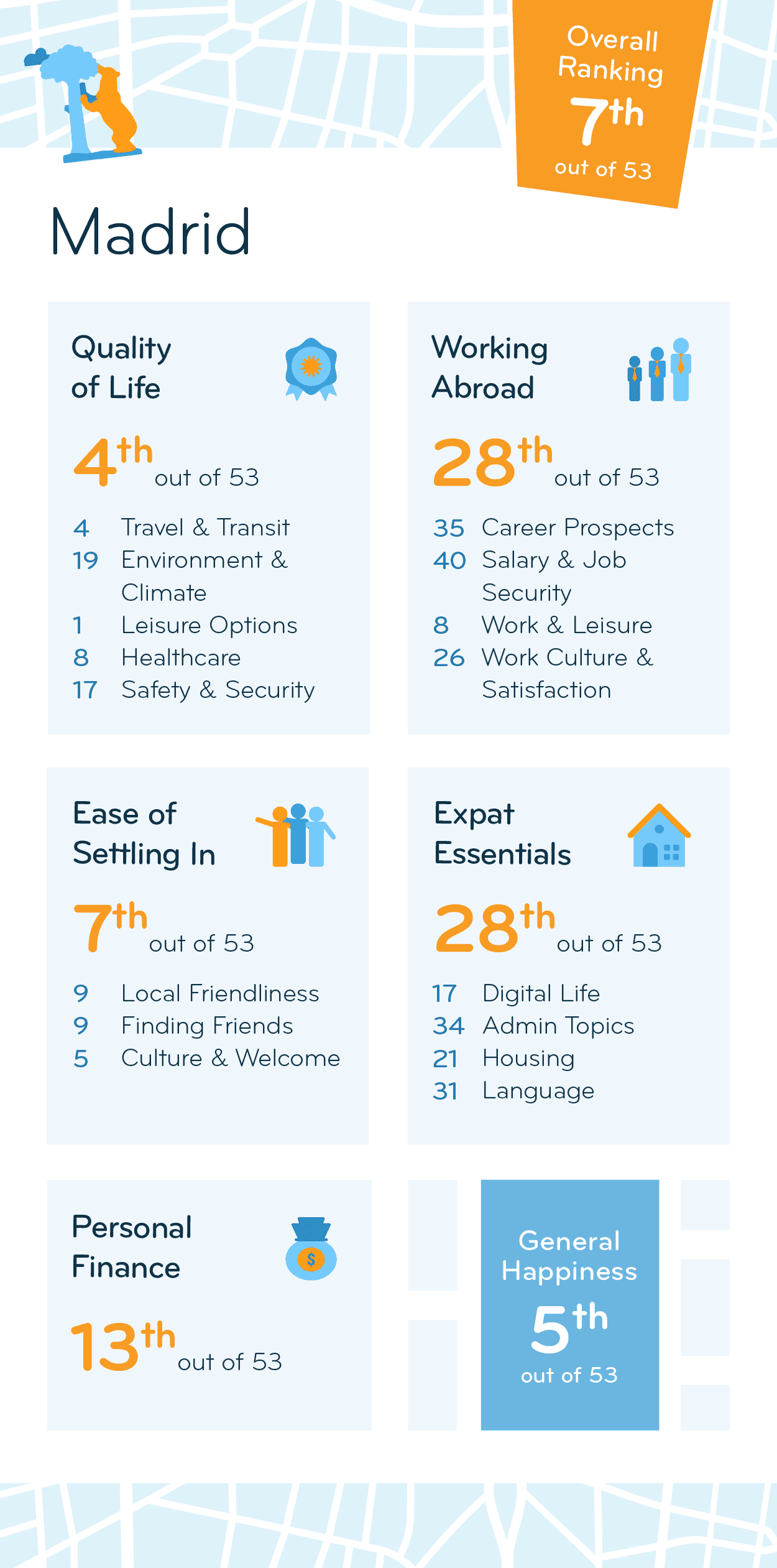 Madrid is a familiar face in the top 10 of the Expat City Ranking, coming in 7th place for 2024. As in the previous two years, the Quality of Life (4th) and Ease of Settling In (7th) Indices land in the top 10, while Personal Finance exits, slipping 3 spots to rank 13th.