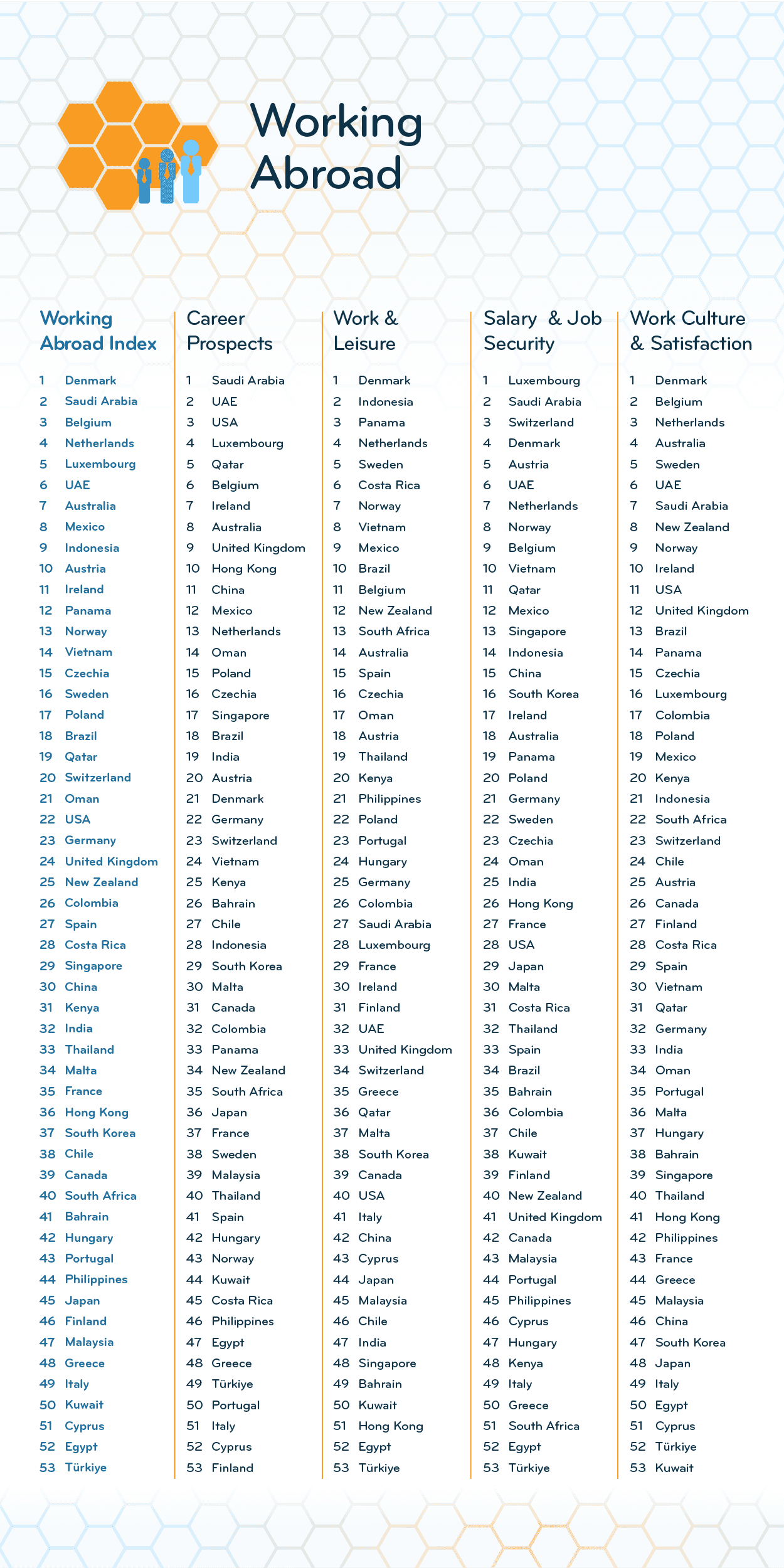 The UAE (6th) joins Saudi Arabia (2nd) to represent the Middle East in the top 10. That’s good news for the around three in five respondents who moved there for work-related reasons (63% Saudi Arabia; 58% UAE; vs. 35% globally). Both destinations rank very well for Career Prospects (2nd UAE, 1st Saudi Arabia) and Work Culture & Satisfaction (6th, 7th).
